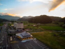 田中裕一+中本剛志 / STUDIO YYによる、岡山・真庭市の「蒜山そばの館」。市営店舗の再建計画。蕎麦の文化や地域の伝統も感受できる場を目指し、周辺家屋を参照した“入母屋”を地場の木材と技術を用いた“CLTパネル”で造る建築を考案。山並と呼応する三次元曲面の庇で人と風景も繋ぐ俯瞰、東側より見下ろす。夕景 photo©秋田広樹 エスエス