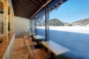 田中裕一+中本剛志 / STUDIO YYによる、岡山・真庭市の「蒜山そばの館」。市営店舗の再建計画。蕎麦の文化や地域の伝統も感受できる場を目指し、周辺家屋を参照した“入母屋”を地場の木材と技術を用いた“CLTパネル”で造る建築を考案。山並と呼応する三次元曲面の庇で人と風景も繋ぐ北側の縁側客席(降雪時の様子) photo©秋田広樹 エスエス