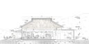 田中裕一+中本剛志 / STUDIO YYによる、岡山・真庭市の「蒜山そばの館」。市営店舗の再建計画。蕎麦の文化や地域の伝統も感受できる場を目指し、周辺家屋を参照した“入母屋”を地場の木材と技術を用いた“CLTパネル”で造る建築を考案。山並と呼応する三次元曲面の庇で人と風景も繋ぐ断面パース image©STUDIO YY