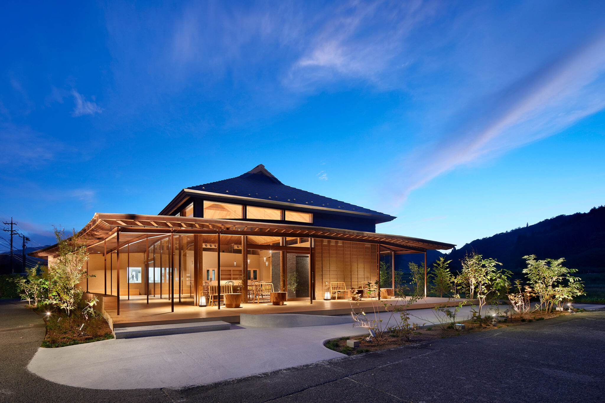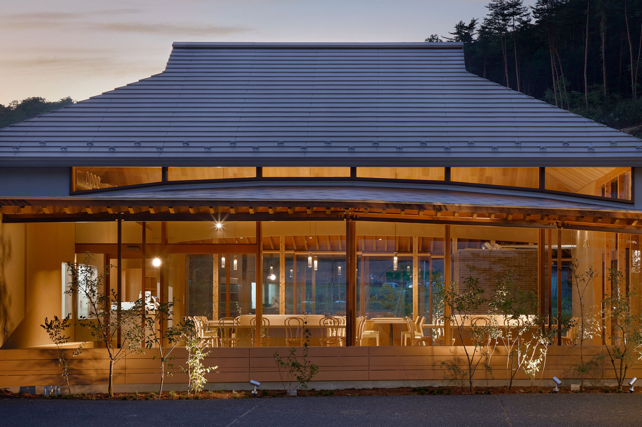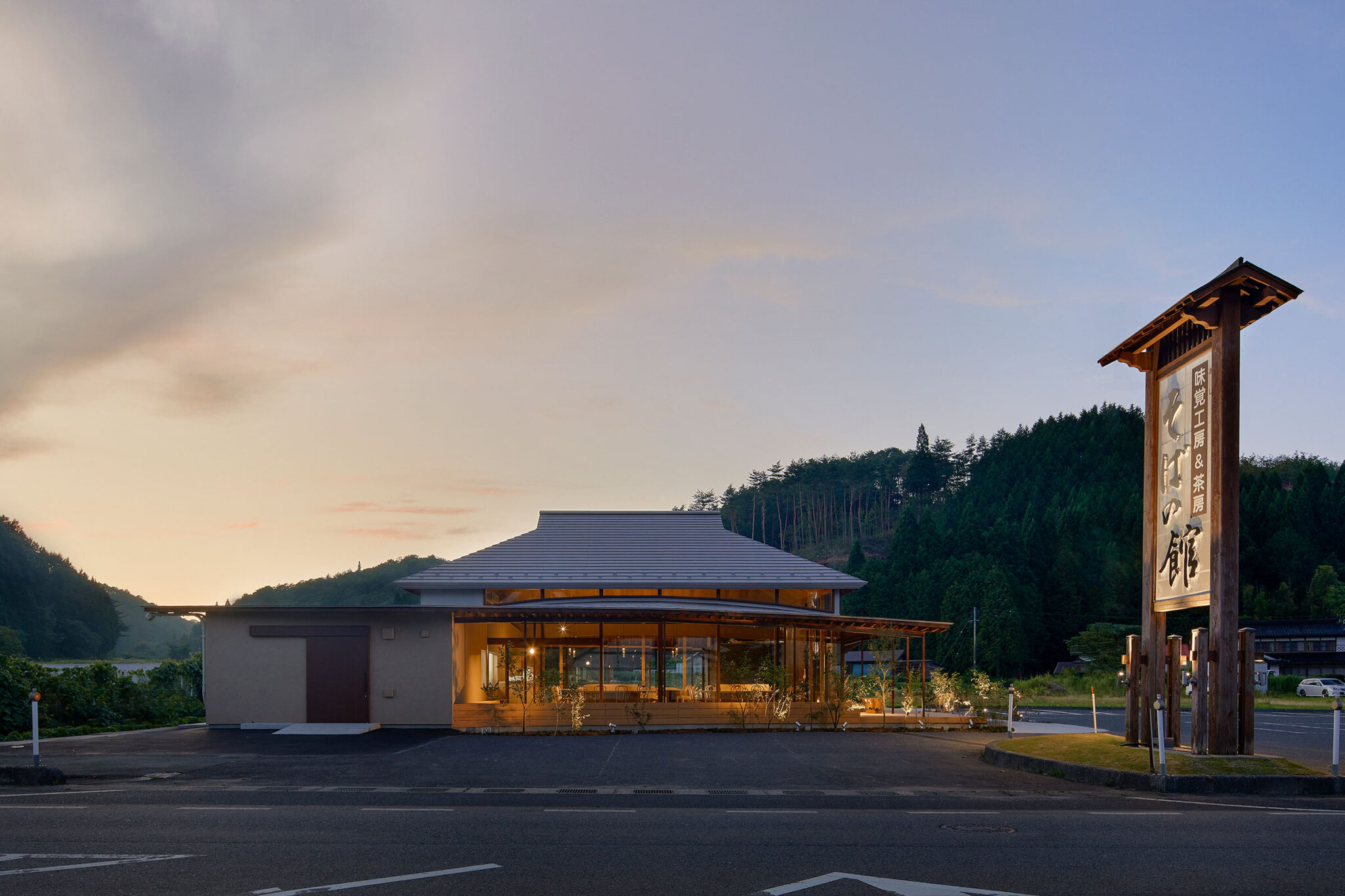 田中裕一+中本剛志 / STUDIO YYによる、岡山・真庭市の「蒜山そばの館」。市営店舗の再建計画。蕎麦の文化や地域の伝統も感受できる場を目指し、周辺家屋を参照した“入母屋”を地場の木材と技術を用いた“CLTパネル”で造る建築を考案。山並と呼応する三次元曲面の庇で人と風景も繋ぐ外観、南側の道路より見る。夕景 photo©秋田広樹 エスエス