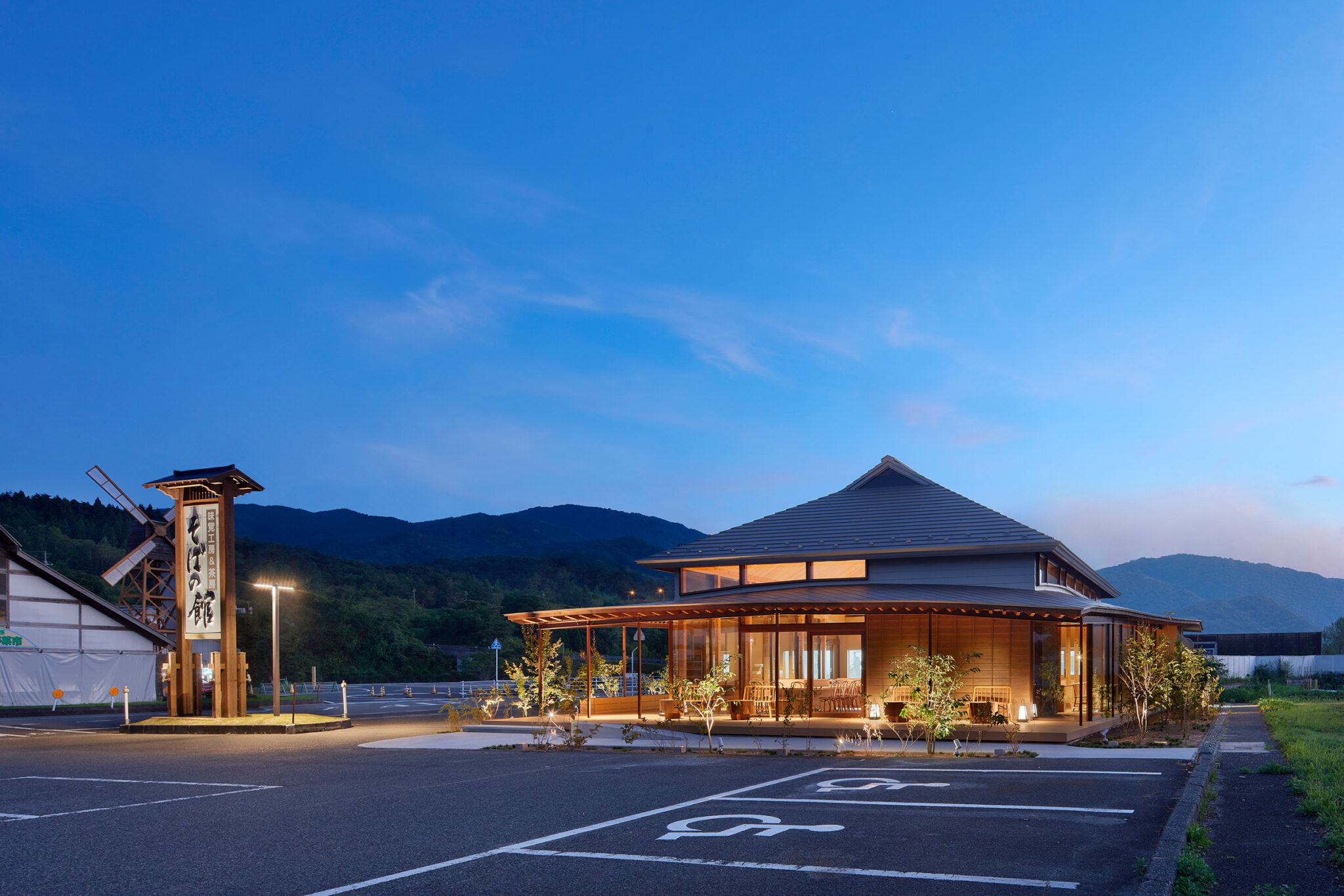 田中裕一+中本剛志 / STUDIO YYによる、岡山・真庭市の「蒜山そばの館」。市営店舗の再建計画。蕎麦の文化や地域の伝統も感受できる場を目指し、周辺家屋を参照した“入母屋”を地場の木材と技術を用いた“CLTパネル”で造る建築を考案。山並と呼応する三次元曲面の庇で人と風景も繋ぐ外観、南側より見る。夕景 photo©秋田広樹 エスエス