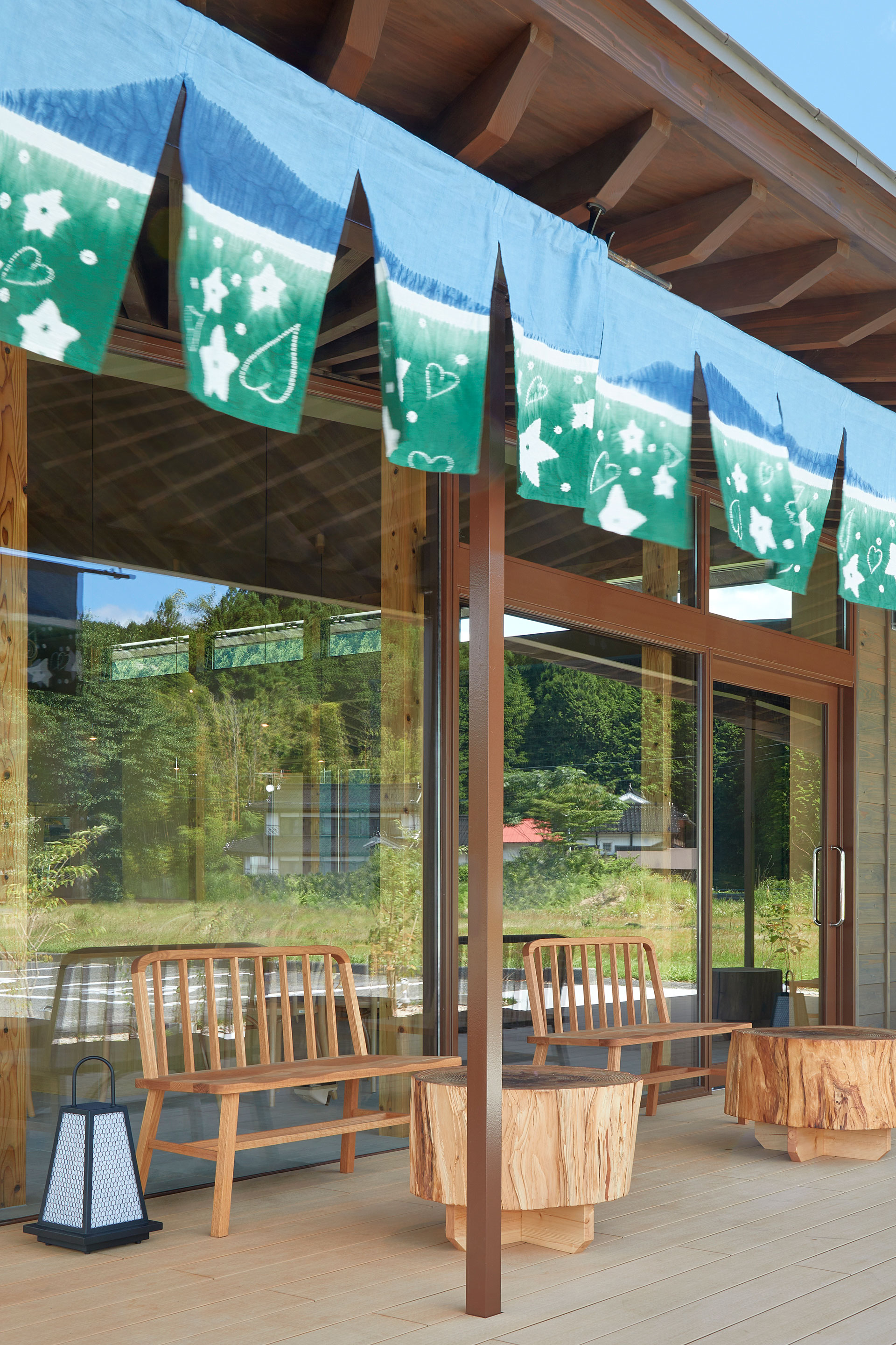 外周の庇部分は背後に連なる蒜山三座の山並に呼応するように、緩やかに高さを変える3次元曲面となっており、庇が蒜山の横に延びる山々の風景を切り取り、人と風景をつなぐ場となっている。建物の入口には、蒜山のシンボルでもある蒜山三座をモチーフとした暖簾を、市内の勝山に残る染め物技術を使い製作し、家具には真庭の組子細工を用いるなど、地場の工芸技術も取り入れている。