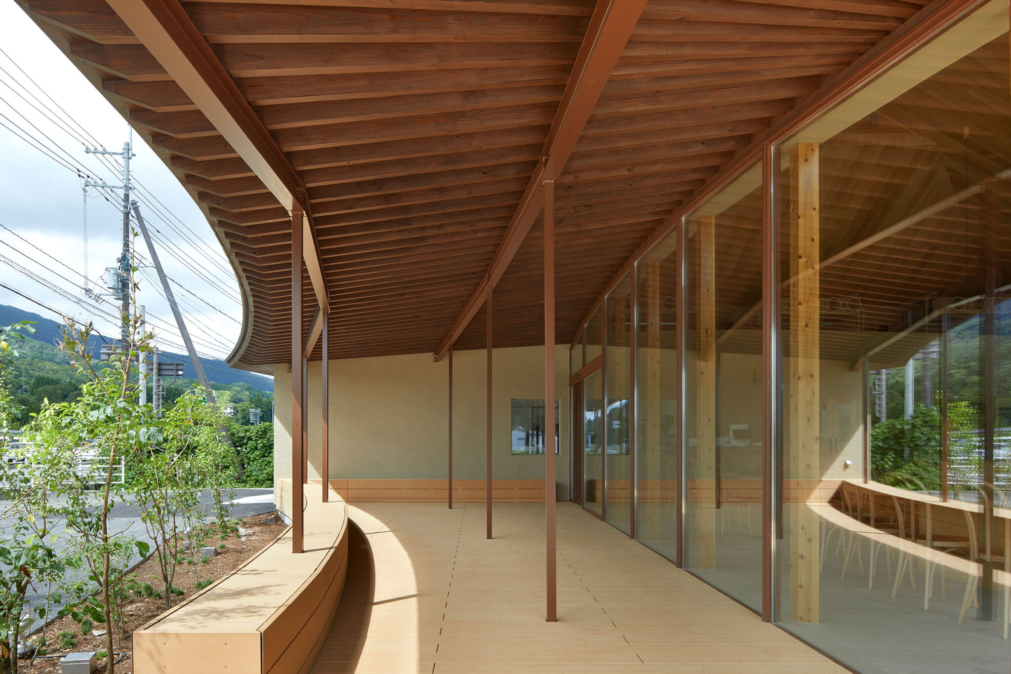 田中裕一+中本剛志 / STUDIO YYによる、岡山・真庭市の「蒜山そばの館」。市営店舗の再建計画。蕎麦の文化や地域の伝統も感受できる場を目指し、周辺家屋を参照した“入母屋”を地場の木材と技術を用いた“CLTパネル”で造る建築を考案。山並と呼応する三次元曲面の庇で人と風景も繋ぐ北側の縁側客席 photo©秋田広樹 エスエス