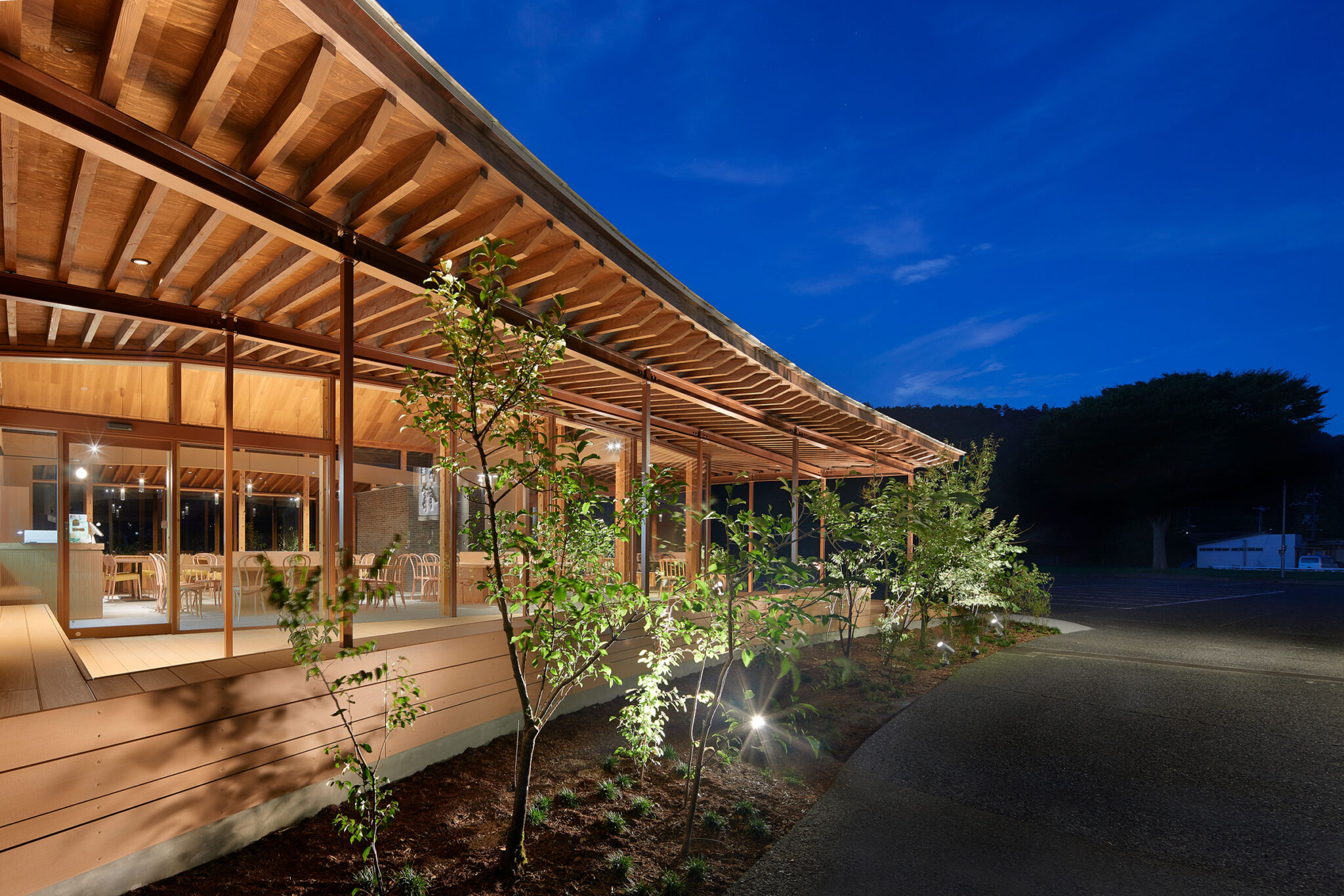 田中裕一+中本剛志 / STUDIO YYによる、岡山・真庭市の「蒜山そばの館」。市営店舗の再建計画。蕎麦の文化や地域の伝統も感受できる場を目指し、周辺家屋を参照した“入母屋”を地場の木材と技術を用いた“CLTパネル”で造る建築を考案。山並と呼応する三次元曲面の庇で人と風景も繋ぐ客席からWC側を見る。夜景 photo©秋田広樹 エスエス