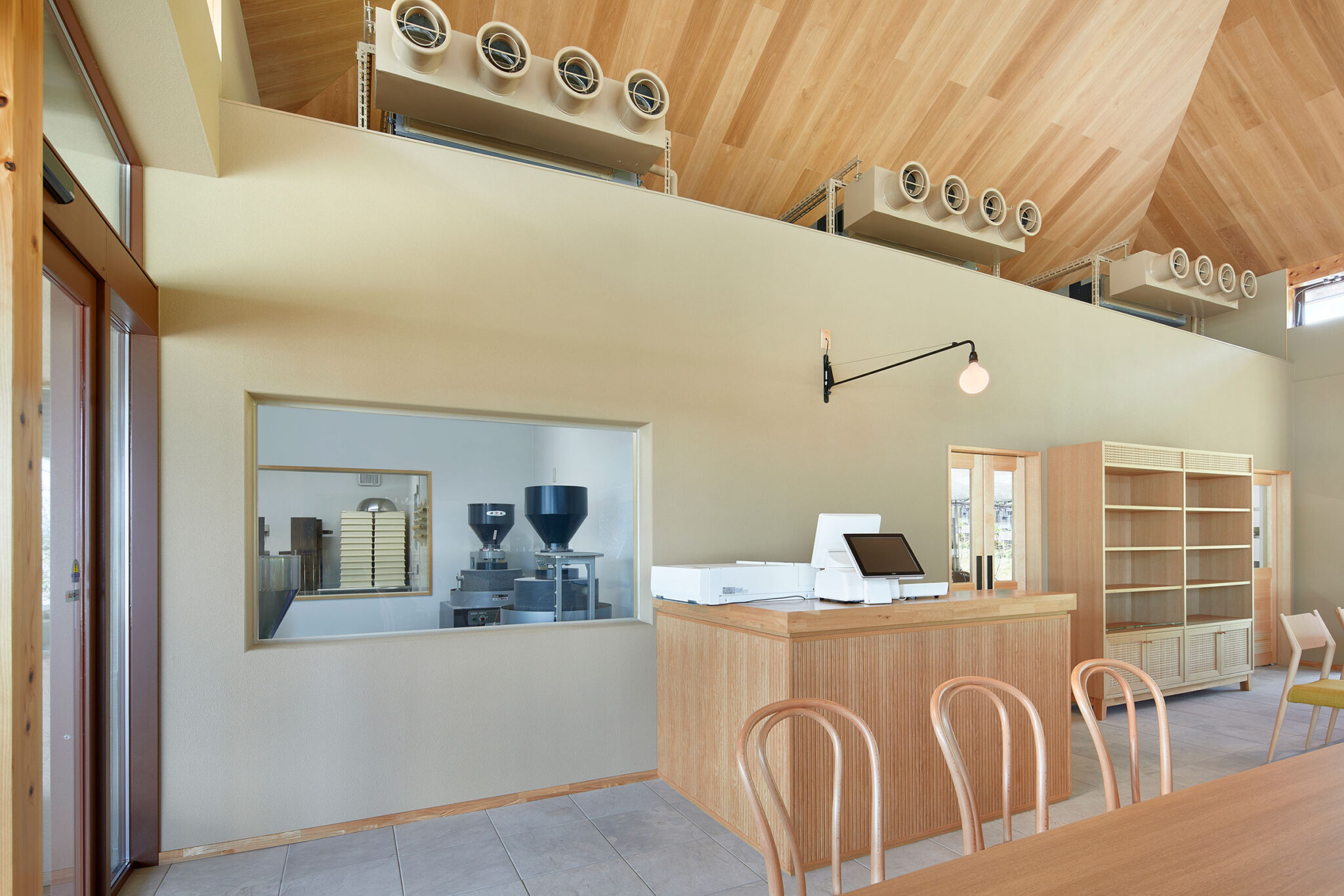 田中裕一+中本剛志 / STUDIO YYによる、岡山・真庭市の「蒜山そばの館」。市営店舗の再建計画。蕎麦の文化や地域の伝統も感受できる場を目指し、周辺家屋を参照した“入母屋”を地場の木材と技術を用いた“CLTパネル”で造る建築を考案。山並と呼応する三次元曲面の庇で人と風景も繋ぐエントランス横から開口部越しに石臼挽き加工室を見る。 photo©秋田広樹 エスエス