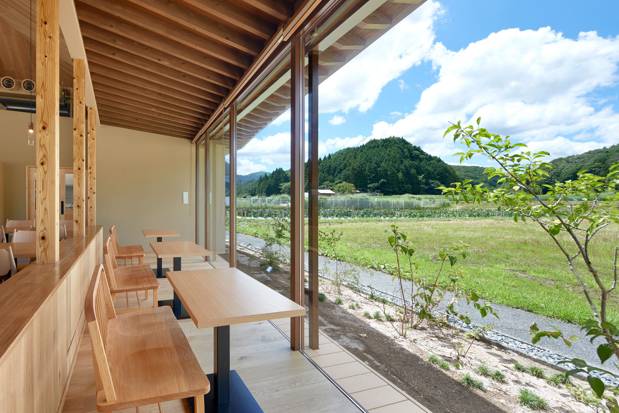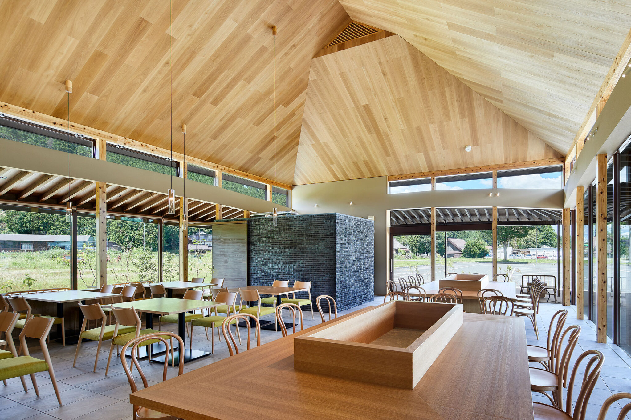 田中裕一+中本剛志 / STUDIO YYによる、岡山・真庭市の「蒜山そばの館」。市営店舗の再建計画。蕎麦の文化や地域の伝統も感受できる場を目指し、周辺家屋を参照した“入母屋”を地場の木材と技術を用いた“CLTパネル”で造る建築を考案。山並と呼応する三次元曲面の庇で人と風景も繋ぐ厨房側から客席を見る。 photo©秋田広樹 エスエス