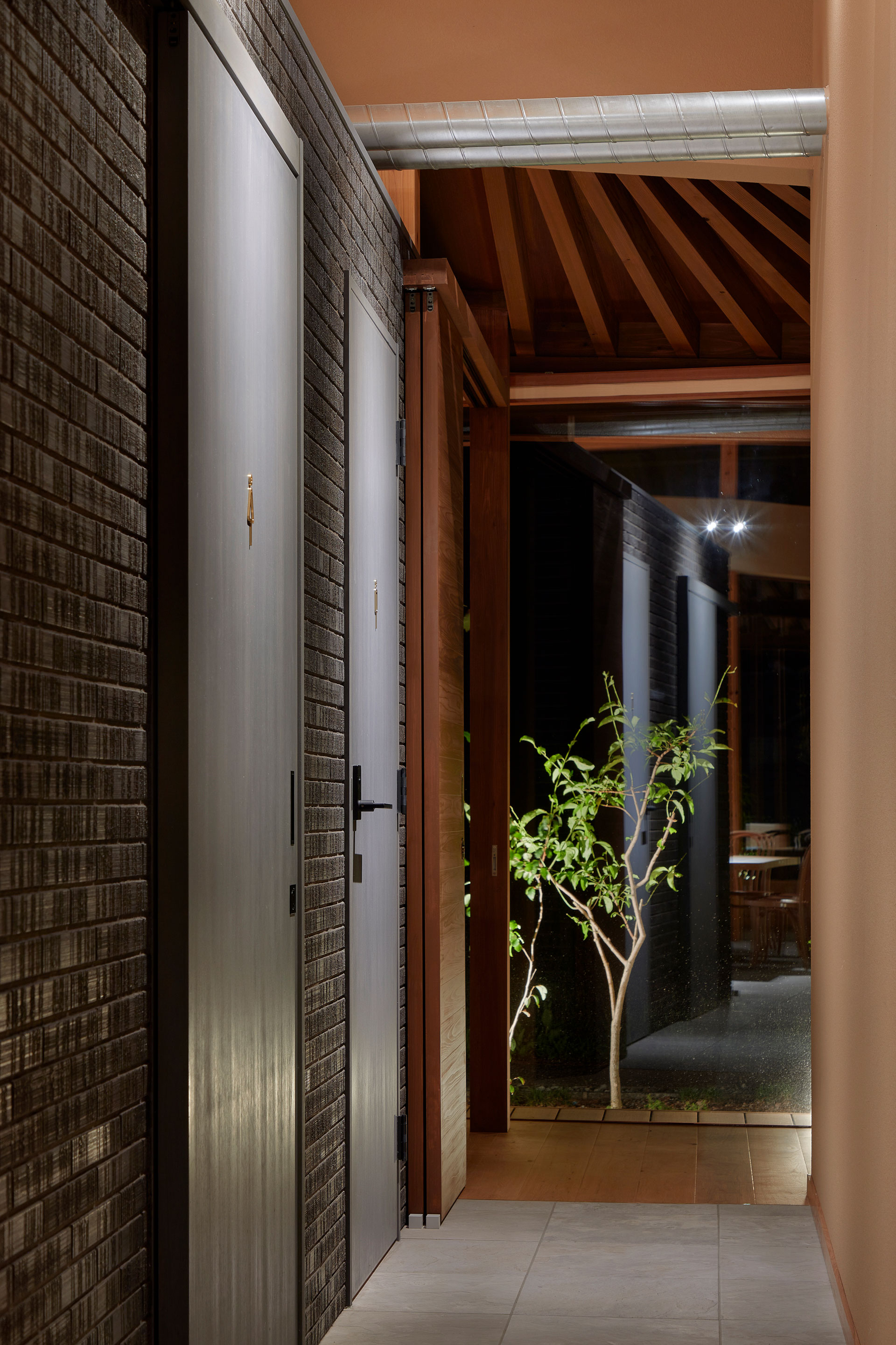 三野貞佳 / アリアナ建築設計事務所による、京都市の「西ノ京の家」。様々な使い方を想定した“うなぎの寝床”に建つ住宅。限られた敷地の有効活用を求め、空間を分断しない“Y字の門型トラス”で支える建築を考案。“三枚の扉”を導入して用途に合わせた繋がり方の調整も可能とする
