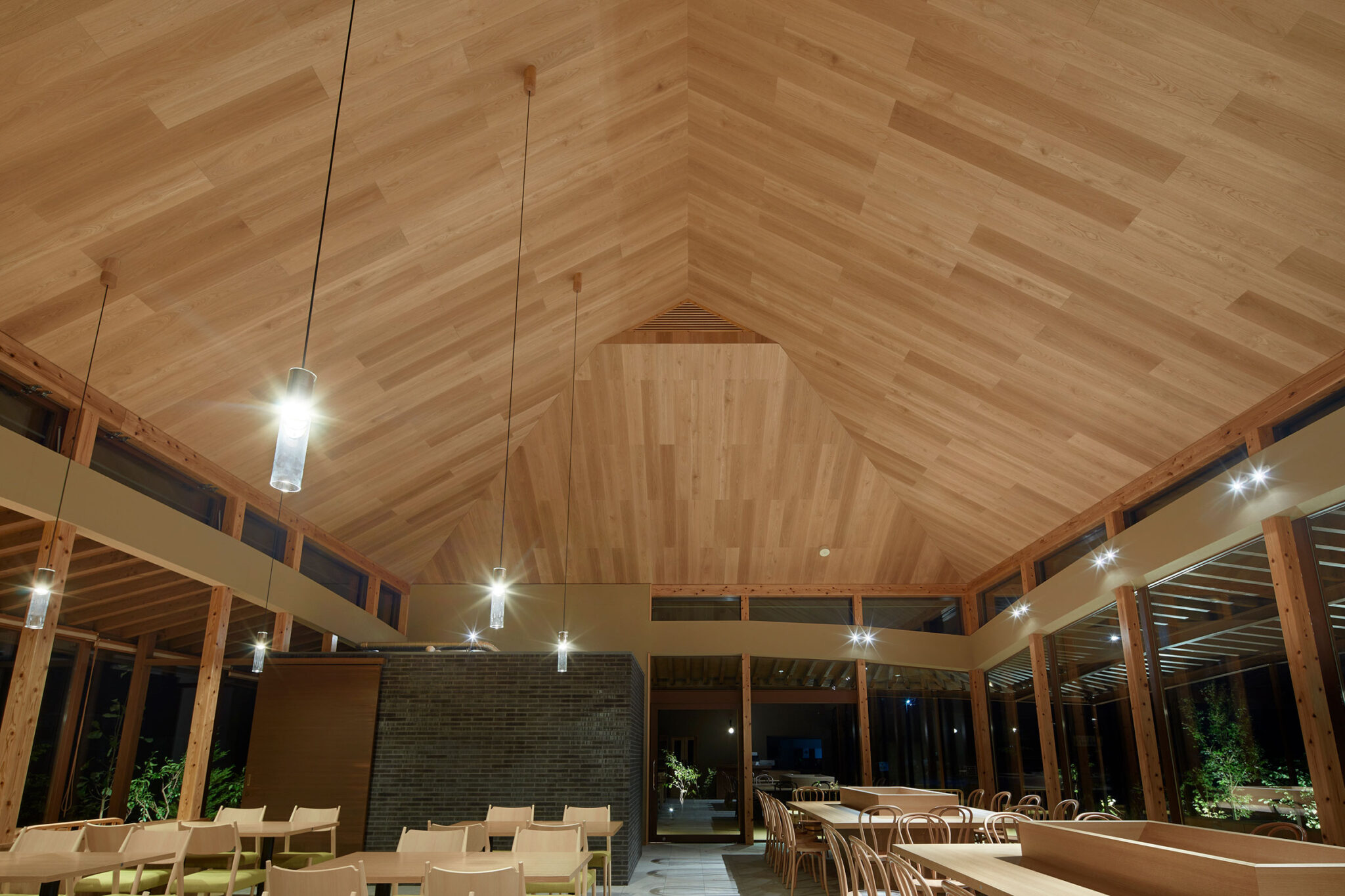 田中裕一+中本剛志 / STUDIO YYによる、岡山・真庭市の「蒜山そばの館」。市営店舗の再建計画。蕎麦の文化や地域の伝統も感受できる場を目指し、周辺家屋を参照した“入母屋”を地場の木材と技術を用いた“CLTパネル”で造る建築を考案。山並と呼応する三次元曲面の庇で人と風景も繋ぐ客席、天井を見上げる。夜景 photo©秋田広樹 エスエス