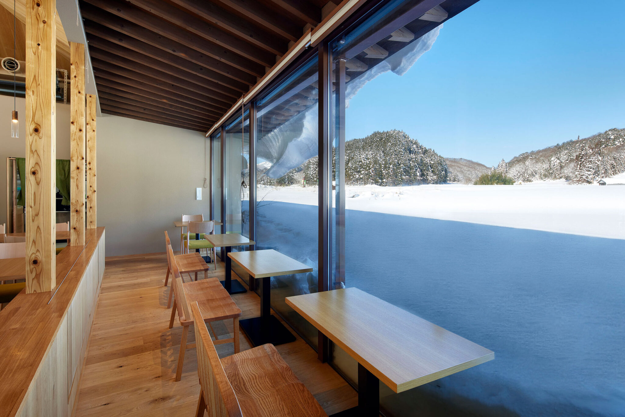 田中裕一+中本剛志 / STUDIO YYによる、岡山・真庭市の「蒜山そばの館」。市営店舗の再建計画。蕎麦の文化や地域の伝統も感受できる場を目指し、周辺家屋を参照した“入母屋”を地場の木材と技術を用いた“CLTパネル”で造る建築を考案。山並と呼応する三次元曲面の庇で人と風景も繋ぐ北側の縁側客席(降雪時の様子) photo©秋田広樹 エスエス