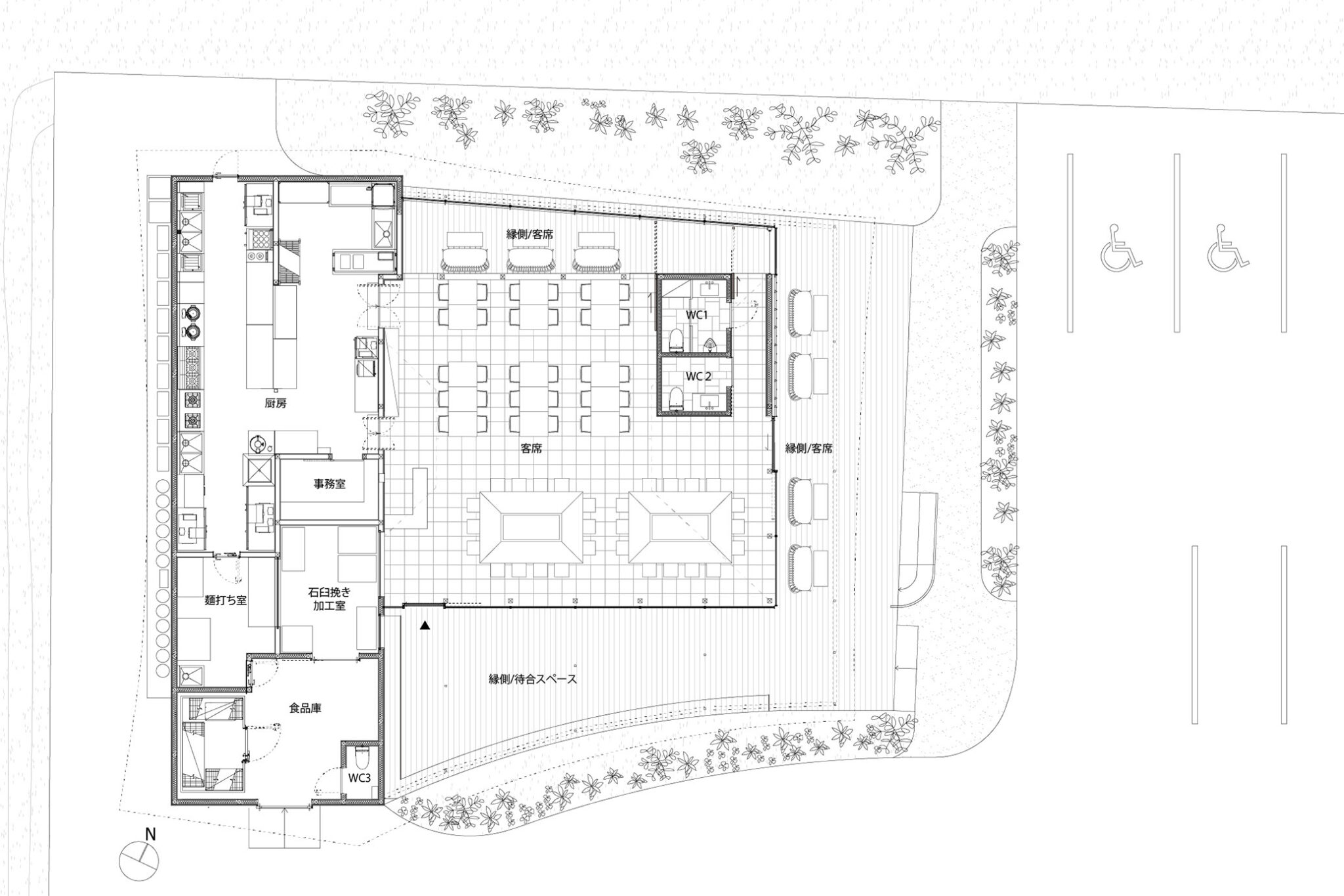 田中裕一+中本剛志 / STUDIO YYによる、岡山・真庭市の「蒜山そばの館」。市営店舗の再建計画。蕎麦の文化や地域の伝統も感受できる場を目指し、周辺家屋を参照した“入母屋”を地場の木材と技術を用いた“CLTパネル”で造る建築を考案。山並と呼応する三次元曲面の庇で人と風景も繋ぐ平面図 image©STUDIO YY