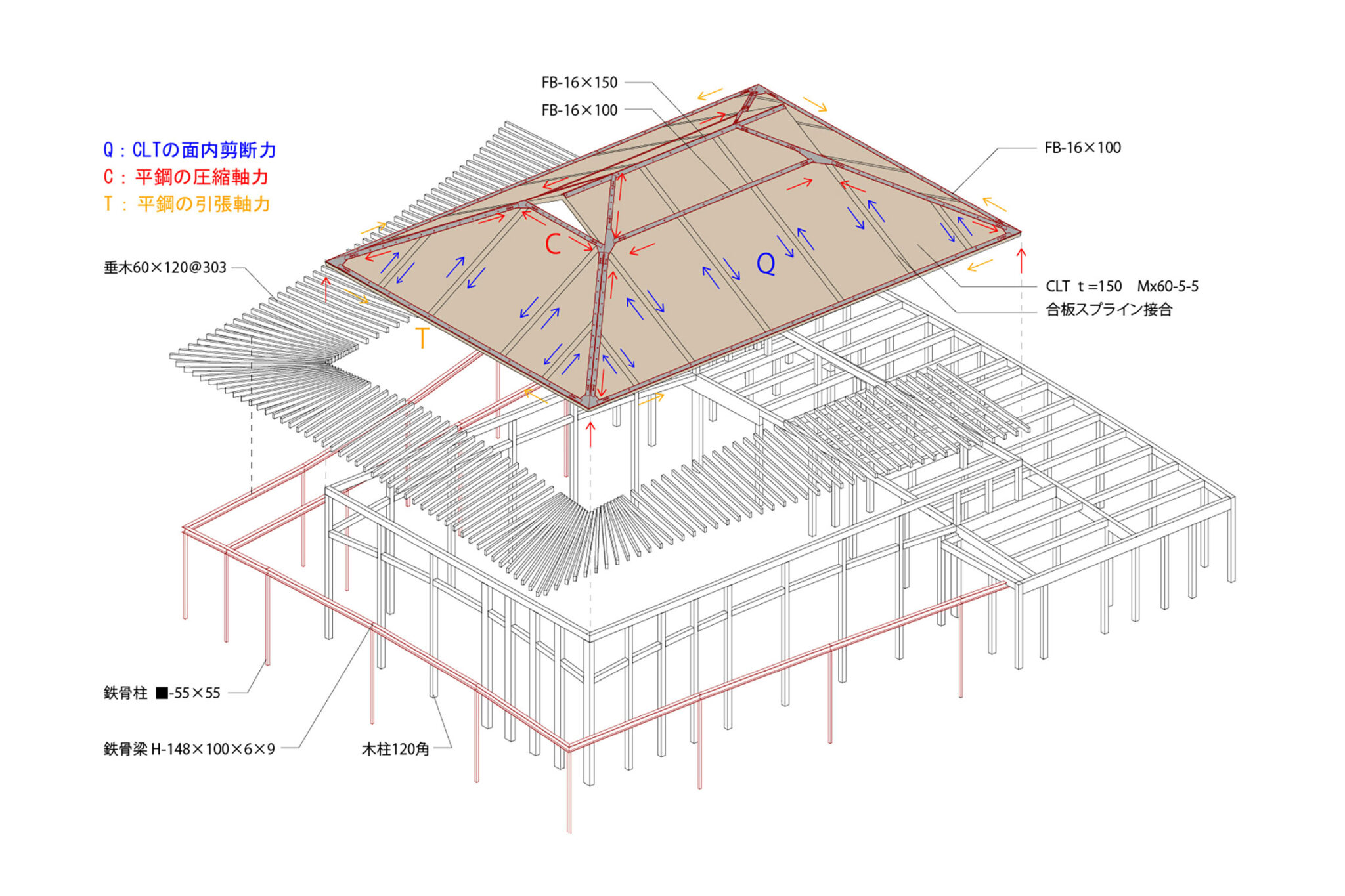 入母屋の形態を活かして鉛直荷重に対して主に面内力で抵抗させることで無柱空間を実現しており、CLTパネルには面内せん断力と2次的な面外曲げモーメントを、棟・降り棟・妻下端の平鋼には圧縮軸力を、四周の平鋼には引張軸力を負担させている。