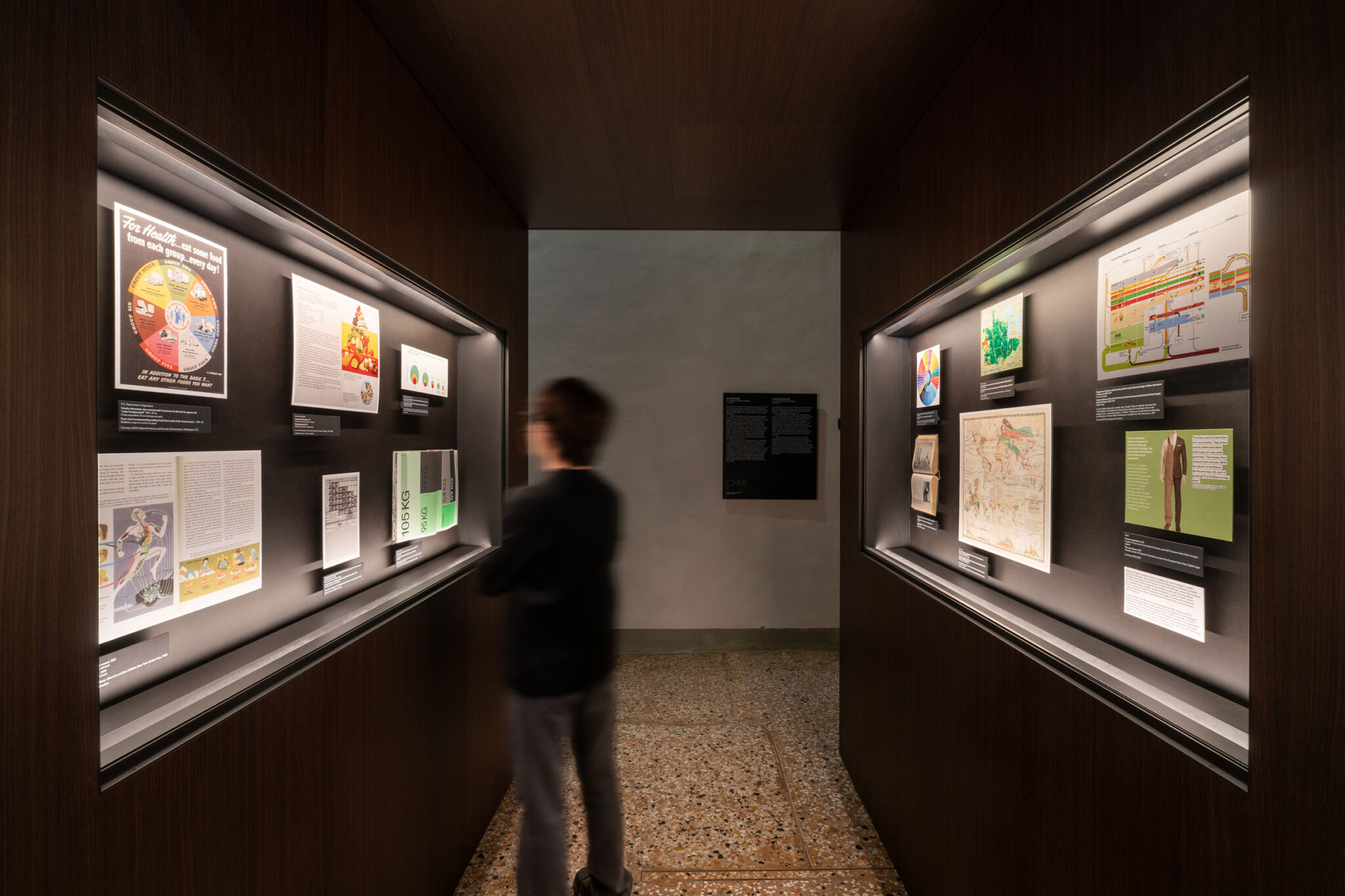 The continuous interplay between the ancient and the modern, which defines the exhibition’s narrative, fosters a reflection that intertwines the form and content of diagrams. Infographic communication formally evolved in the 20th century, influenced by historical avant-gardes. Modernism’s significant contributions to visual communication enable a retrospective reassessment of the formal, aesthetic, and artistic qualities of ancient and pre-modern infographics.