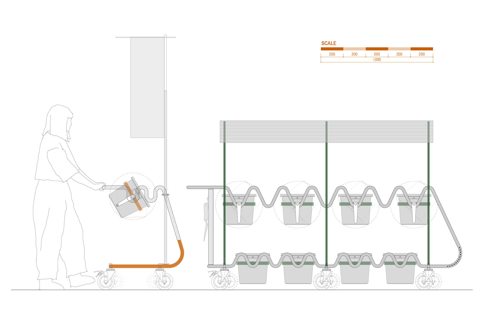 ツバメアーキテクツによる「コンポスト屋台」。移動式の堆肥をつくる装置。集合住宅や商業施設での使用を想定し、“ネコ車とショッピングカートのハイブリッド”と言える形態を考案。手軽なサイズの“ノーマル”とステーションの役割も持つ“デラックス”を用意側面図 photo©ツバメアーキテクツ