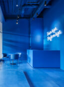 吉田昌弘 / KAMITOPENによる、千葉市の店舗「Hyex 海浜幕張店」。“街かど高地トレーニング”をうたうジム。低酸素ルームで運動する施設として、パフォーマンス向上の為に“空気”のデザインを志向。空の様な“青色”の空間から血液の様な“赤色”の主空間に移行する構成を考案フロント photo©宮本啓介
