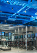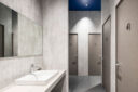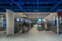 吉田昌弘 / KAMITOPENによる、千葉市の店舗「Hyex 海浜幕張店」。“街かど高地トレーニング”をうたうジム。低酸素ルームで運動する施設として、パフォーマンス向上の為に“空気”のデザインを志向。空の様な“青色”の空間から血液の様な“赤色”の主空間に移行する構成を考案洗面から更衣室側を見る。 photo©宮本啓介