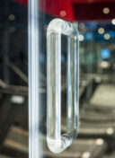 吉田昌弘 / KAMITOPENによる、千葉市の店舗「Hyex 海浜幕張店」。“街かど高地トレーニング”をうたうジム。低酸素ルームで運動する施設として、パフォーマンス向上の為に“空気”のデザインを志向。空の様な“青色”の空間から血液の様な“赤色”の主空間に移行する構成を考案把手の詳細 photo©宮本啓介