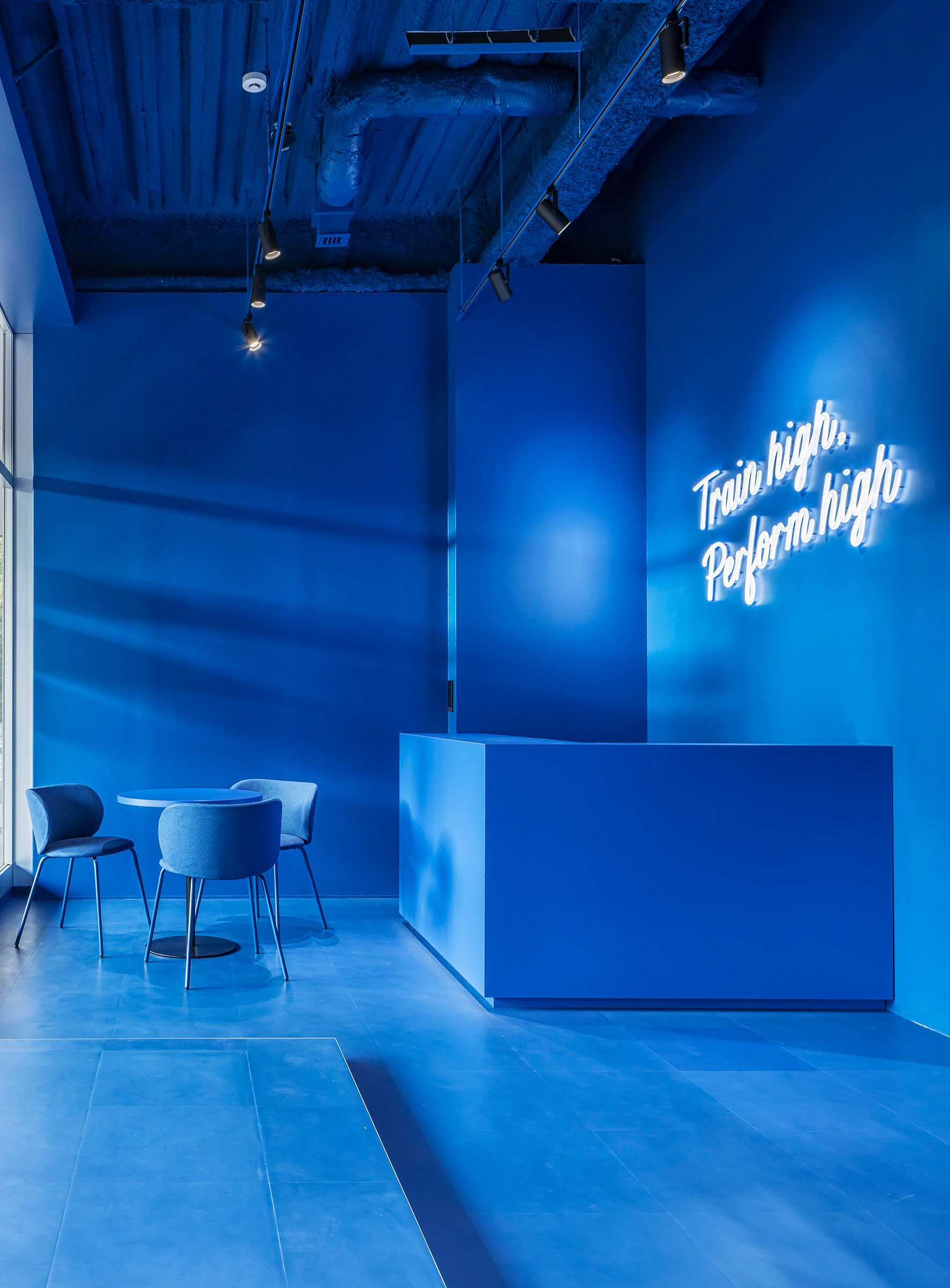 吉田昌弘 / KAMITOPENによる、千葉市の店舗「Hyex 海浜幕張店」。“街かど高地トレーニング”をうたうジム。低酸素ルームで運動する施設として、パフォーマンス向上の為に“空気”のデザインを志向。空の様な“青色”の空間から血液の様な“赤色”の主空間に移行する構成を考案フリースペースからフロント側を見る。 photo©宮本啓介