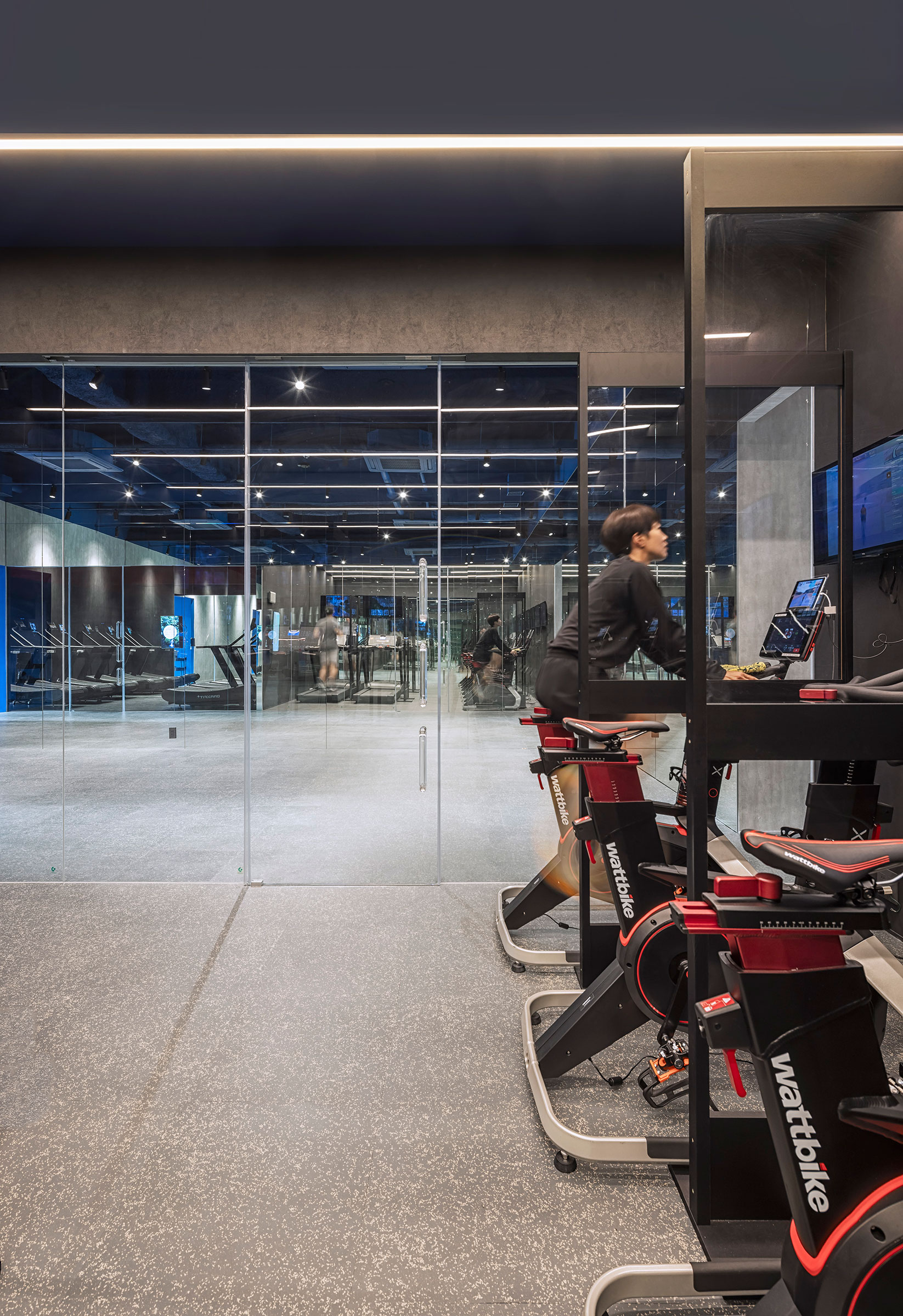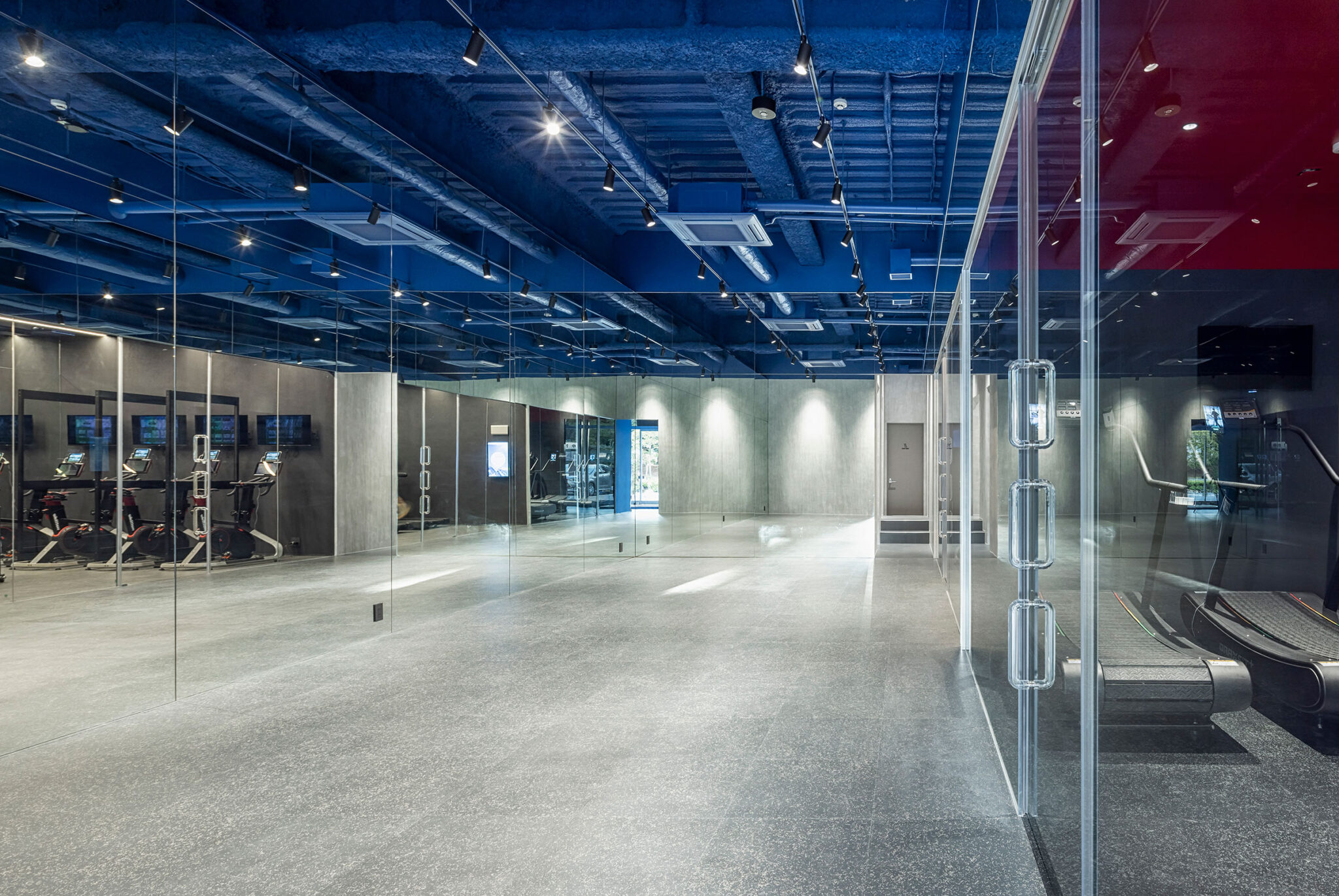 吉田昌弘 / KAMITOPENによる、千葉市の店舗「Hyex 海浜幕張店」。“街かど高地トレーニング”をうたうジム。低酸素ルームで運動する施設として、パフォーマンス向上の為に“空気”のデザインを志向。空の様な“青色”の空間から血液の様な“赤色”の主空間に移行する構成を考案フリースペース photo©宮本啓介