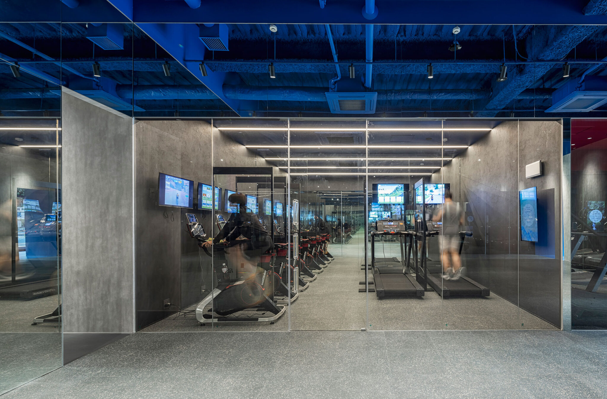 吉田昌弘 / KAMITOPENによる、千葉市の店舗「Hyex 海浜幕張店」。“街かど高地トレーニング”をうたうジム。低酸素ルームで運動する施設として、パフォーマンス向上の為に“空気”のデザインを志向。空の様な“青色”の空間から血液の様な“赤色”の主空間に移行する構成を考案左:「ズイフトルーム」、右:「アスリートルーム」 photo©宮本啓介