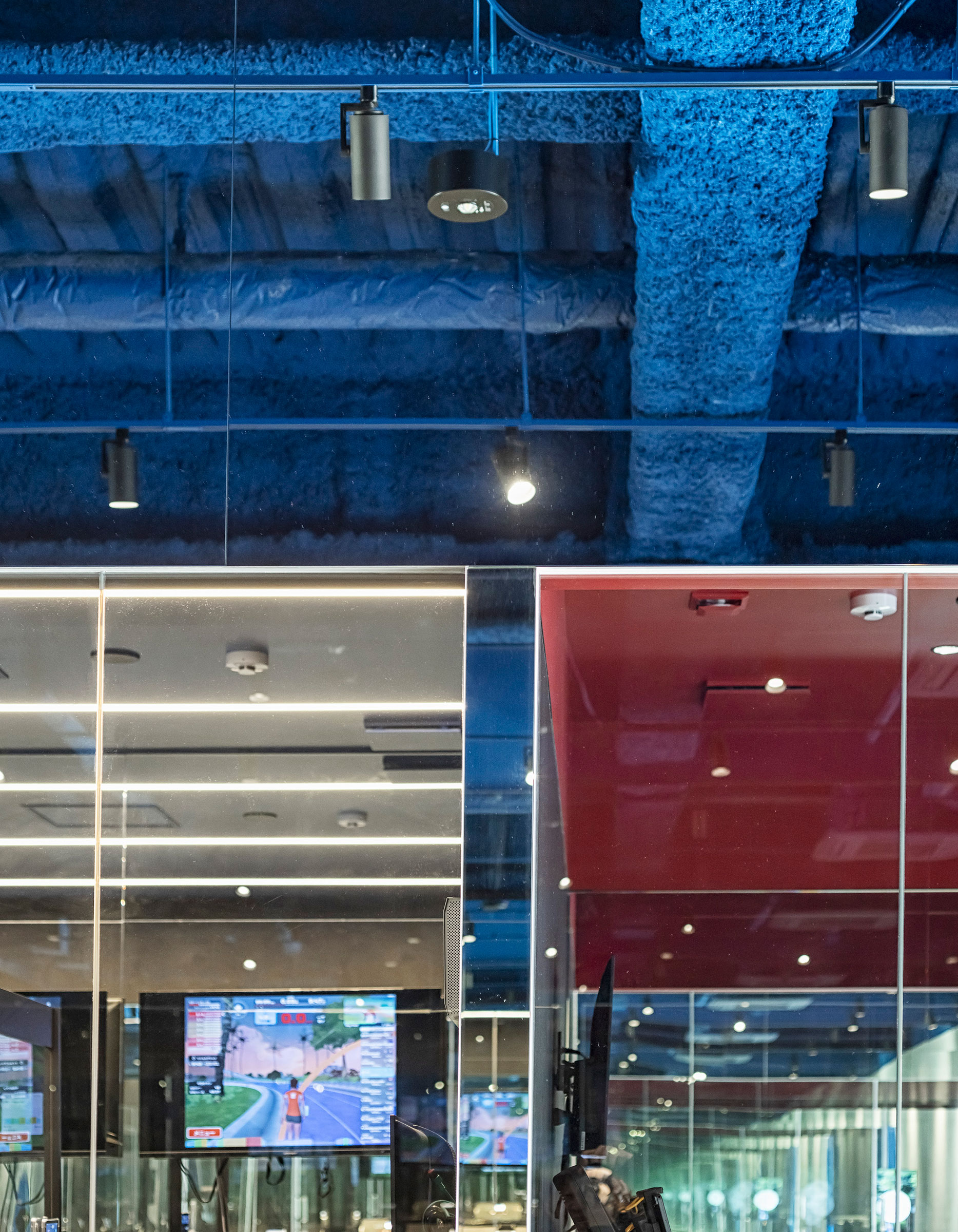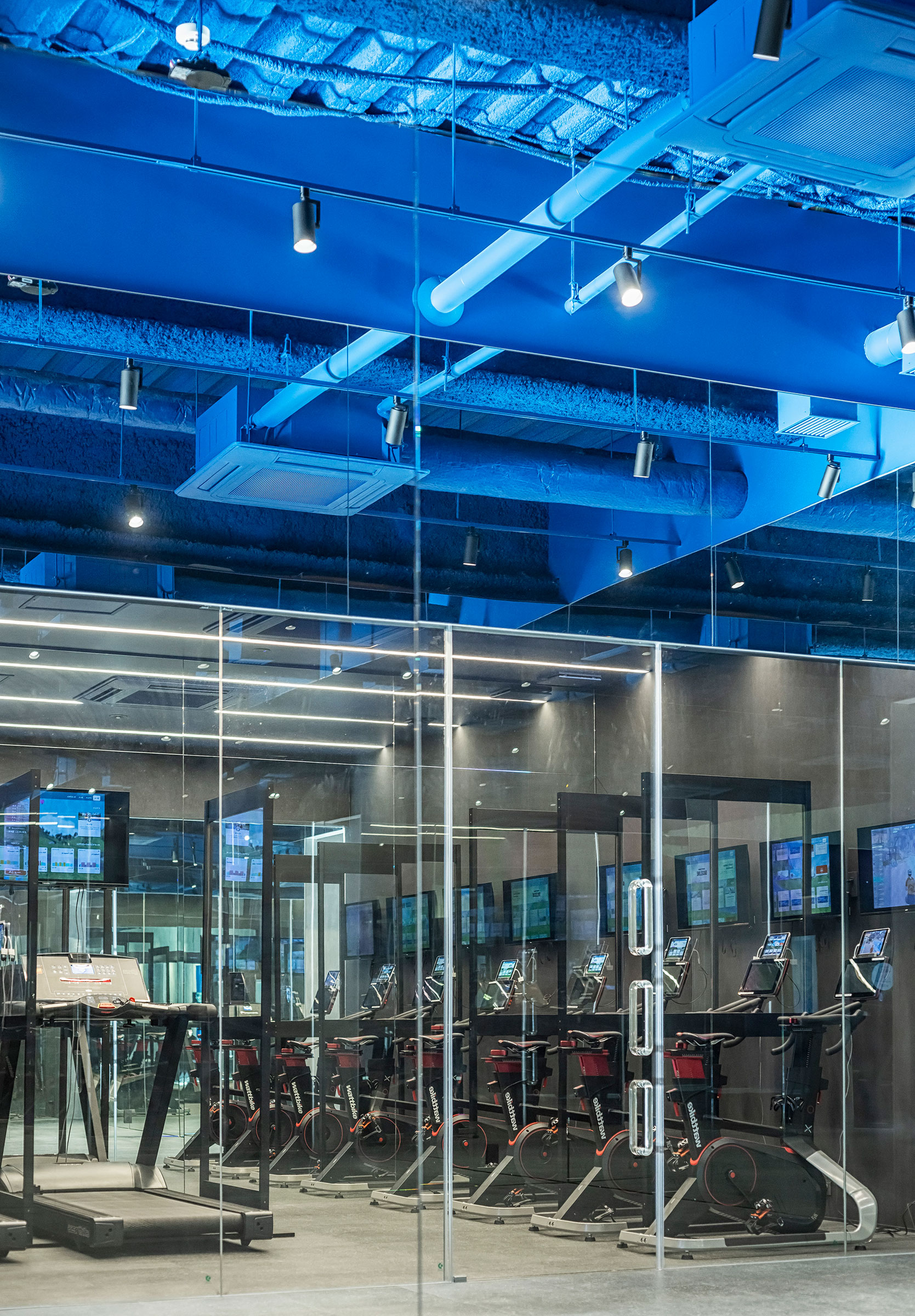 吉田昌弘 / KAMITOPENによる、千葉市の店舗「Hyex 海浜幕張店」。“街かど高地トレーニング”をうたうジム。低酸素ルームで運動する施設として、パフォーマンス向上の為に“空気”のデザインを志向。空の様な“青色”の空間から血液の様な“赤色”の主空間に移行する構成を考案フロント photo©宮本啓介