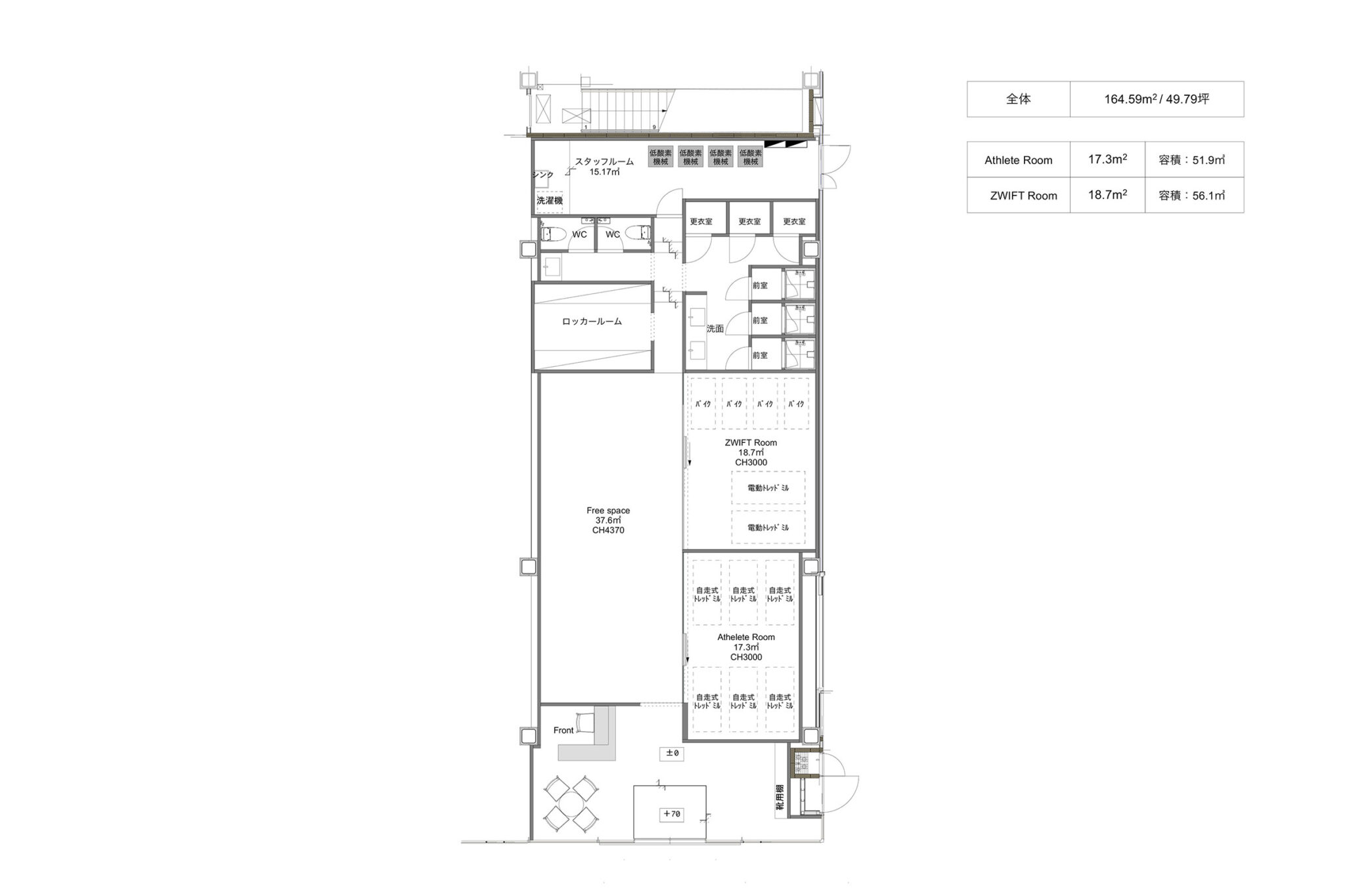 吉田昌弘 / KAMITOPENによる、千葉市の店舗「Hyex 海浜幕張店」。“街かど高地トレーニング”をうたうジム。低酸素ルームで運動する施設として、パフォーマンス向上の為に“空気”のデザインを志向。空の様な“青色”の空間から血液の様な“赤色”の主空間に移行する構成を考案平面図 image©KAMITOPEN一級建築士事務所