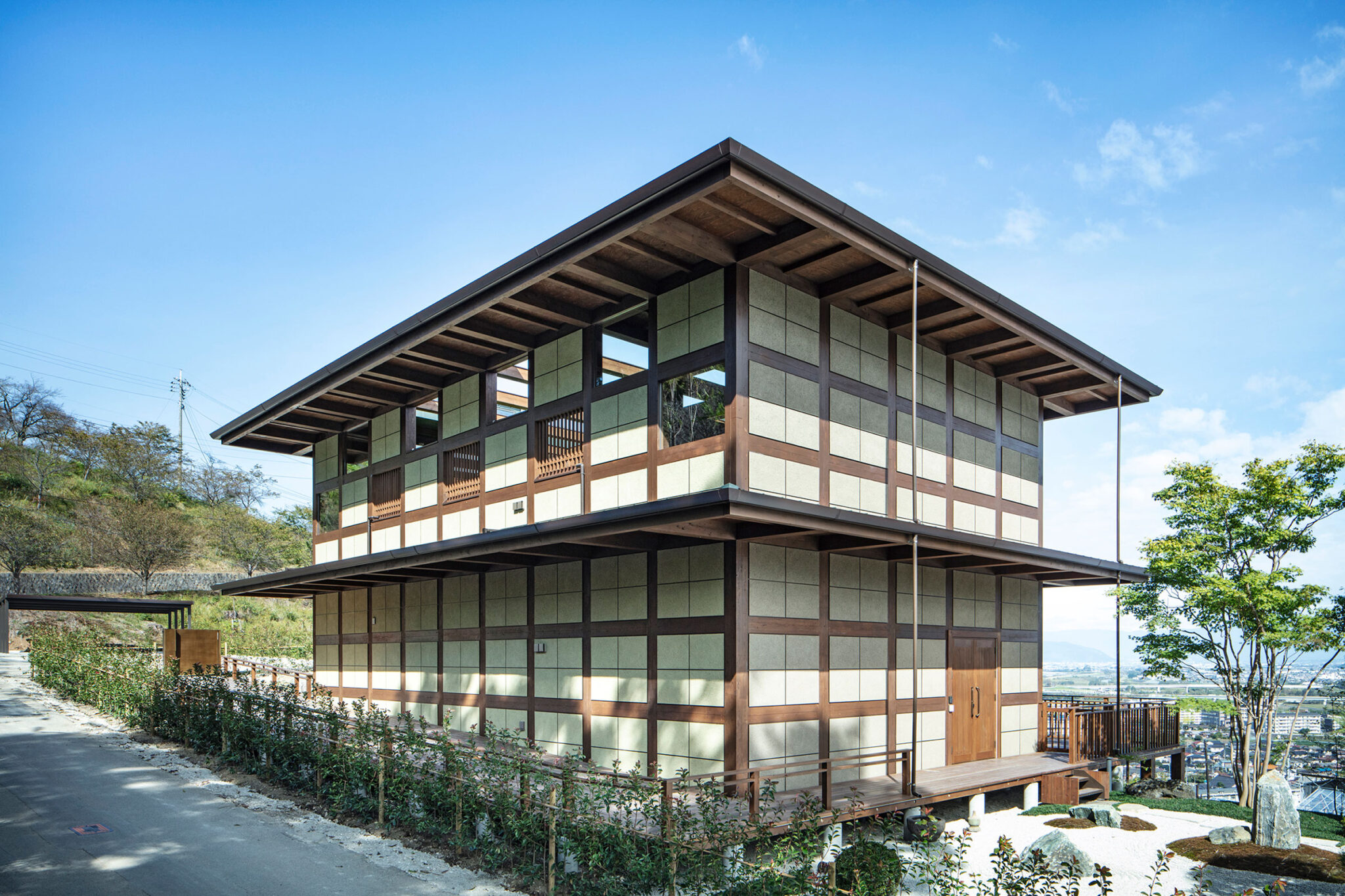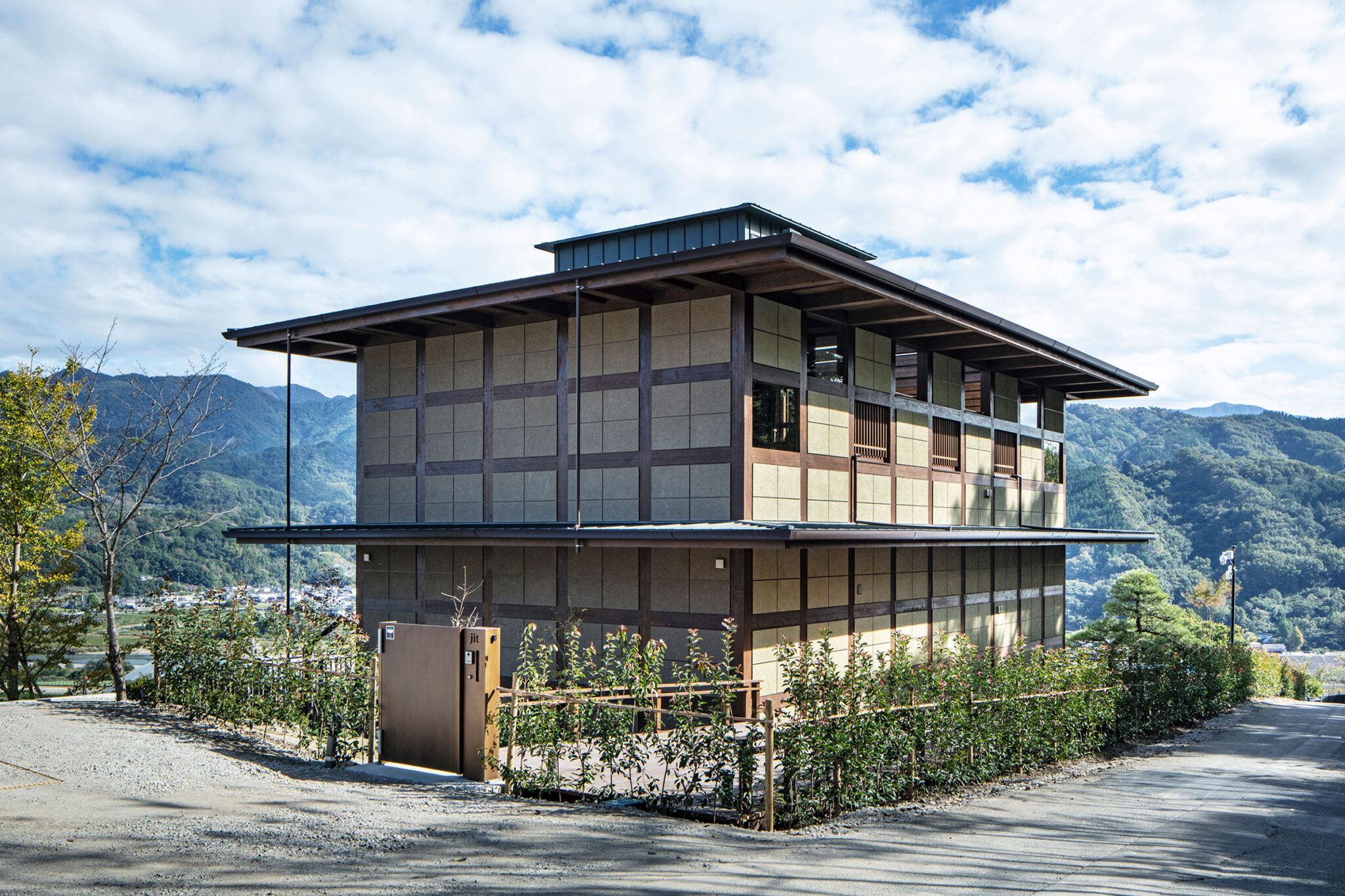 SHARE 浜田晶則建築設計事務所による、山梨の「大法師山の立体格子」。街と山々を臨む“ひな壇状”の土地に建つ社屋。“自然と一体となる思想”を持つ伝統構法の“懸造”を参照し、木組の土台を全体に拡張した“立体格子”の建築を考案。幾重に重なる軸組の層が空間に奥行きをもたらす