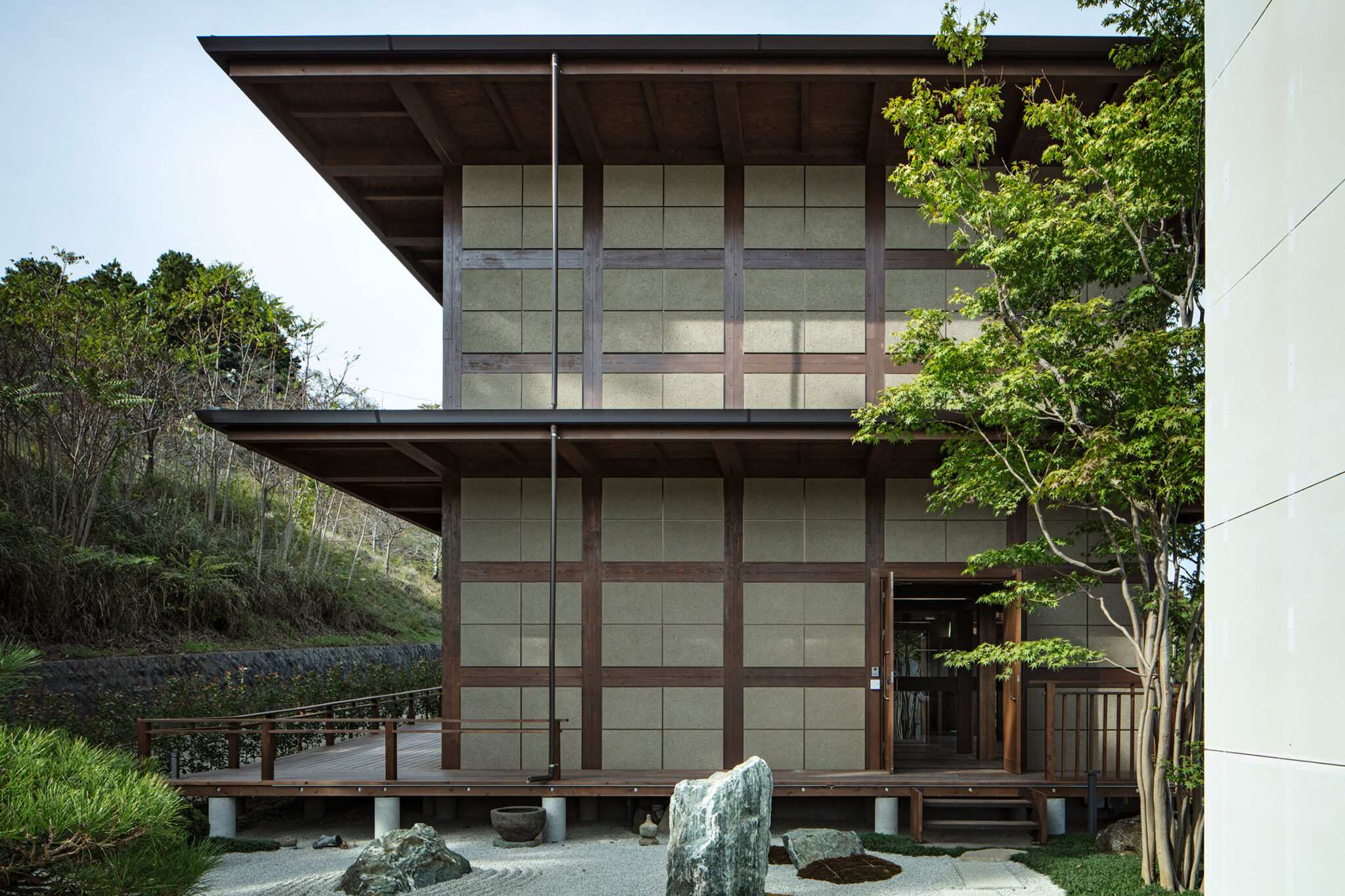 1.82mx1.82mx1.35mのモデュールの木造立体格子に、乾式の土壁パネルが真壁で納まる。パネルは敷地内の土と草を混ぜて配合した。手前には日本庭園と散策路が広がる。