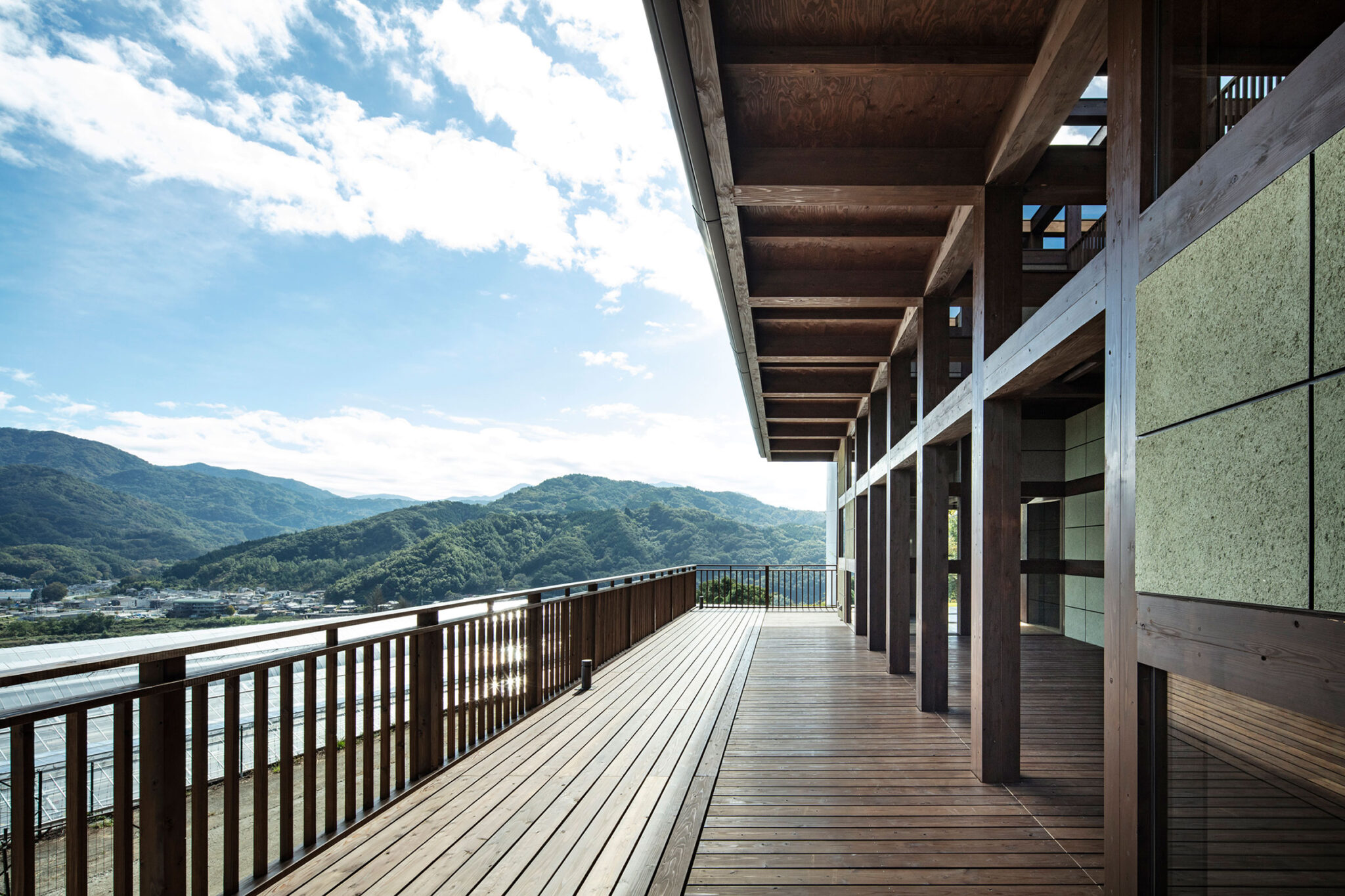 浜田晶則建築設計事務所による、山梨の「大法師山の立体格子」。街と山々を臨む“ひな壇状”の土地に建つ社屋。“自然と一体となる思想”を持つ伝統構法の“懸造”を参照し、木組の土台を全体に拡張した“立体格子”の建築を考案。幾重に重なる軸組の層が空間に奥行きをもたらす1階、テラス photo©長谷川健太