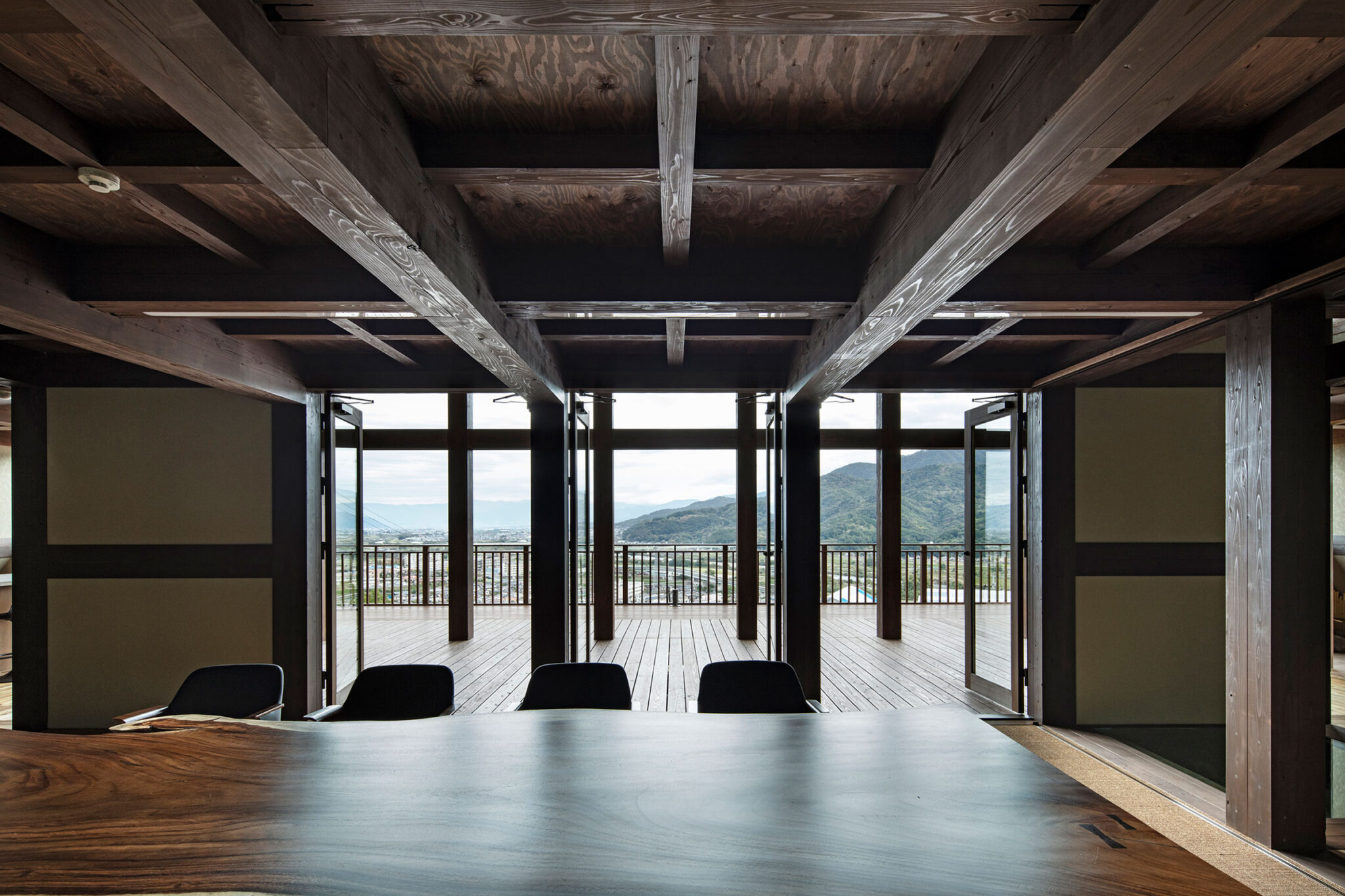 浜田晶則建築設計事務所による、山梨の「大法師山の立体格子」。街と山々を臨む“ひな壇状”の土地に建つ社屋。“自然と一体となる思想”を持つ伝統構法の“懸造”を参照し、木組の土台を全体に拡張した“立体格子”の建築を考案。幾重に重なる軸組の層が空間に奥行きをもたらす1階、会議室から開口部越しにテラスを見る。 photo©長谷川健太