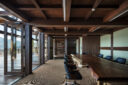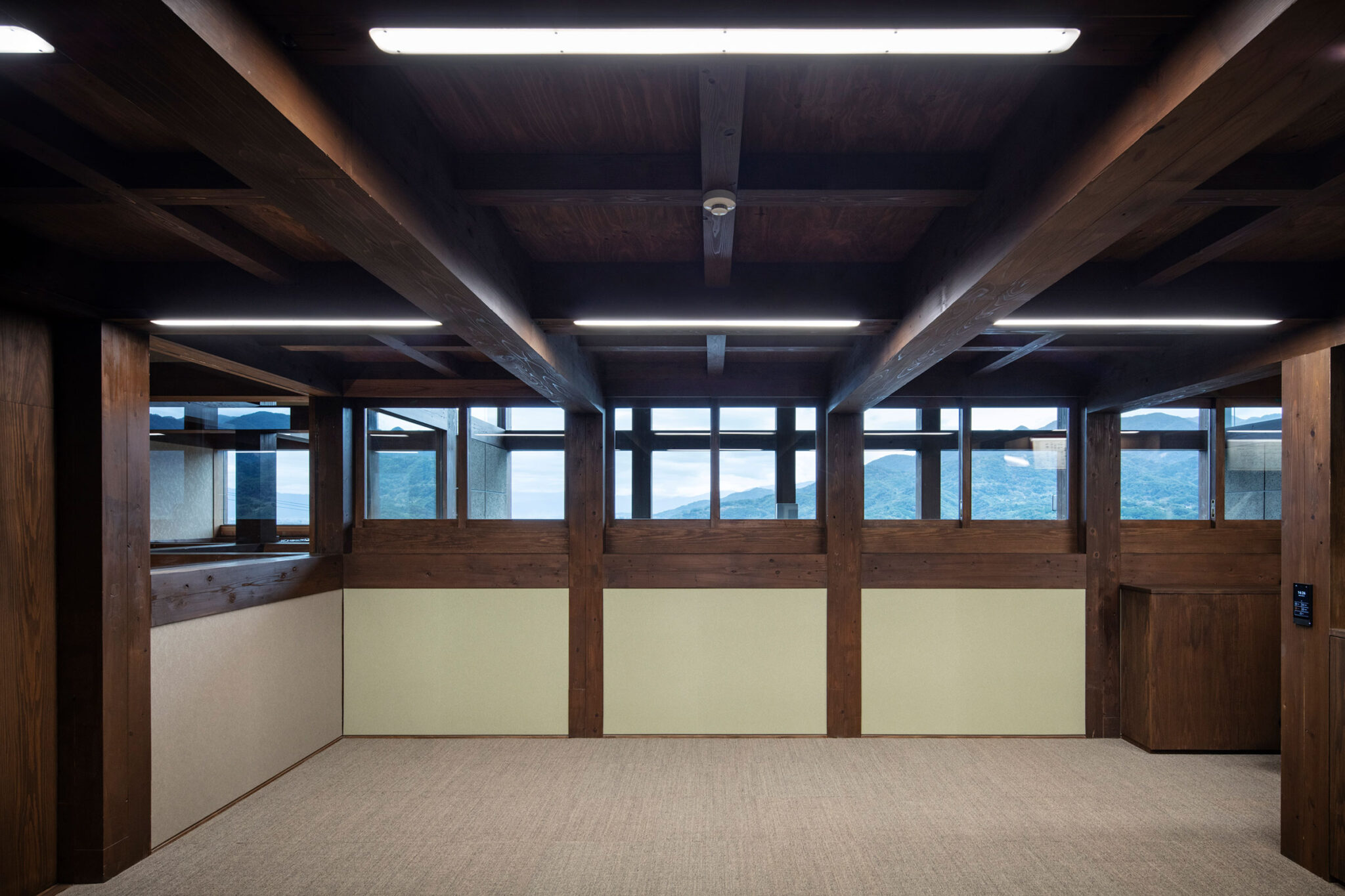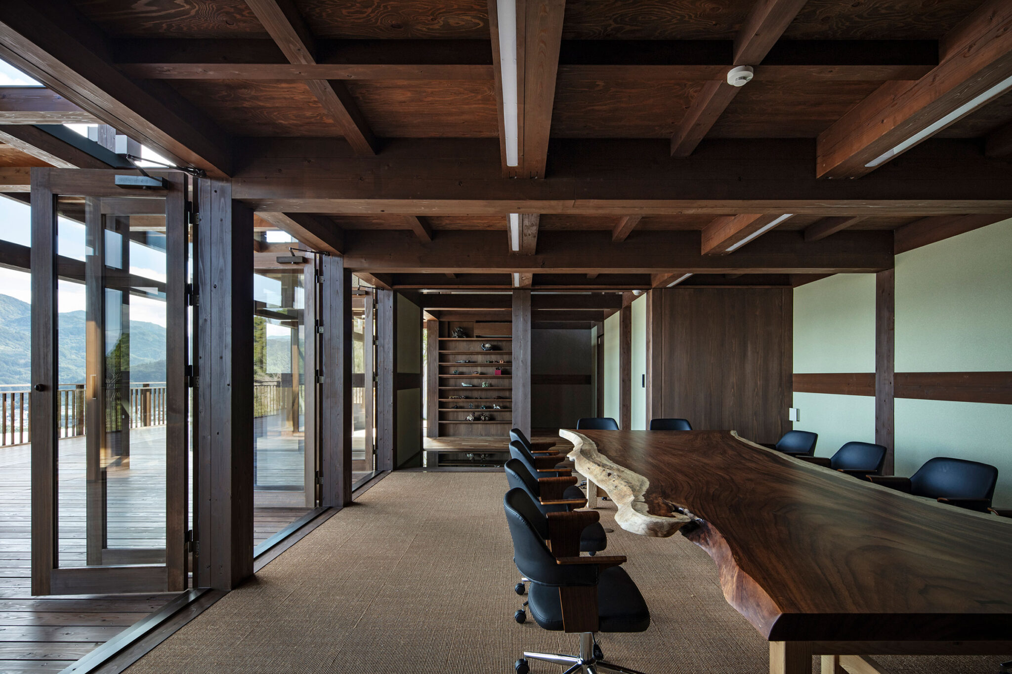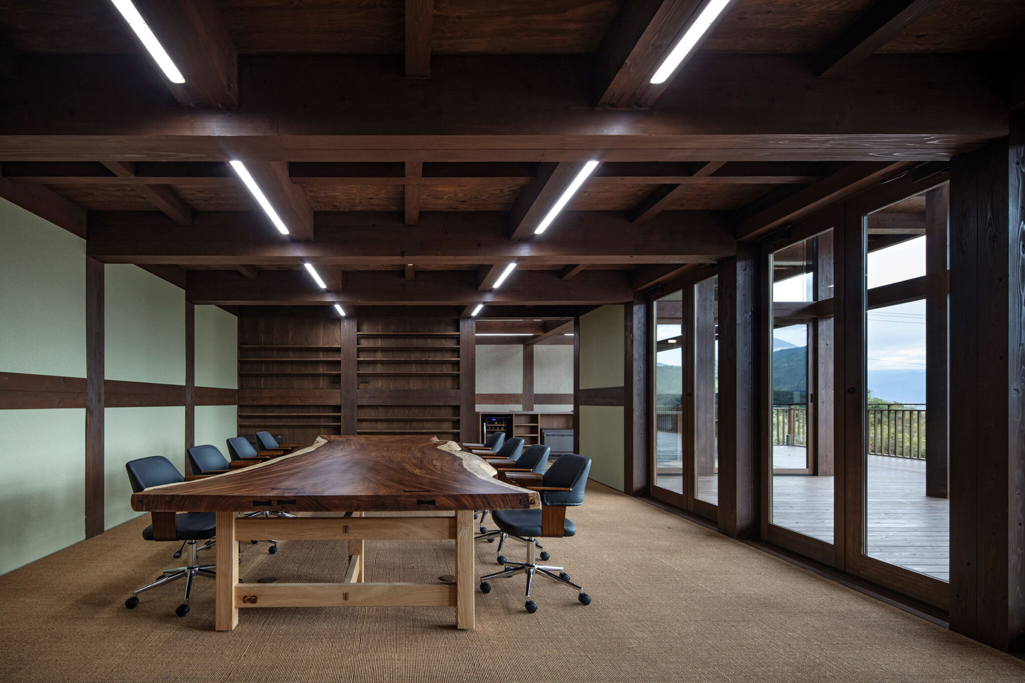 浜田晶則建築設計事務所による、山梨の「大法師山の立体格子」。街と山々を臨む“ひな壇状”の土地に建つ社屋。“自然と一体となる思想”を持つ伝統構法の“懸造”を参照し、木組の土台を全体に拡張した“立体格子”の建築を考案。幾重に重なる軸組の層が空間に奥行きをもたらす1階、会議室 photo©長谷川健太
