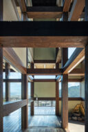 浜田晶則建築設計事務所による、山梨の「大法師山の立体格子」。街と山々を臨む“ひな壇状”の土地に建つ社屋。“自然と一体となる思想”を持つ伝統構法の“懸造”を参照し、木組の土台を全体に拡張した“立体格子”の建築を考案。幾重に重なる軸組の層が空間に奥行きをもたらす2階、プレジデンツオフィス photo©長谷川健太