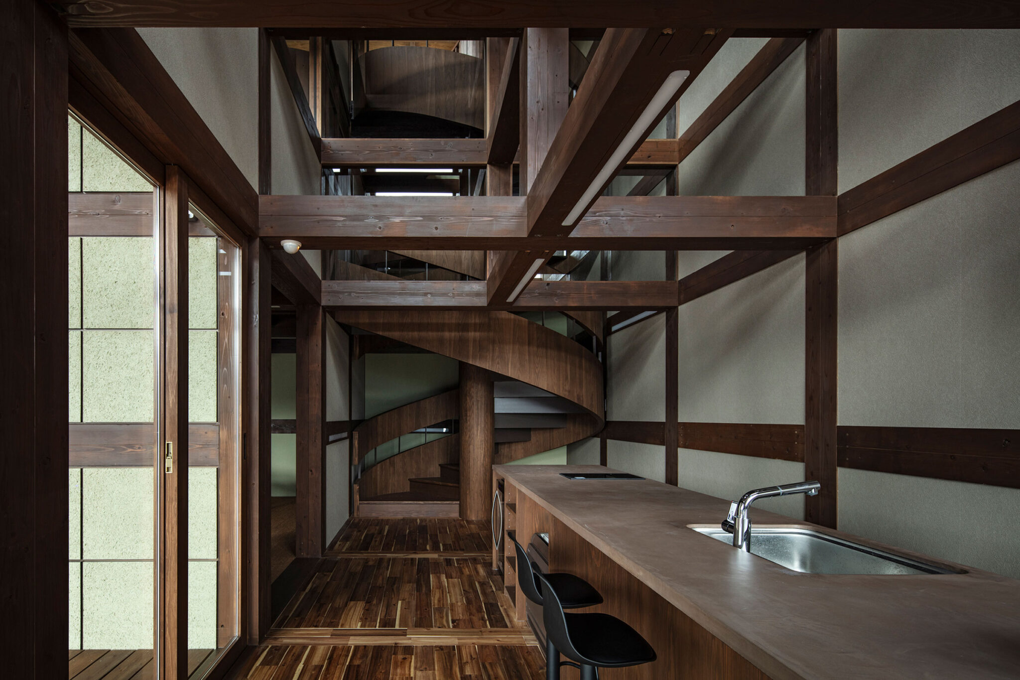 浜田晶則建築設計事務所による、山梨の「大法師山の立体格子」。街と山々を臨む“ひな壇状”の土地に建つ社屋。“自然と一体となる思想”を持つ伝統構法の“懸造”を参照し、木組の土台を全体に拡張した“立体格子”の建築を考案。幾重に重なる軸組の層が空間に奥行きをもたらす1階、キッチンから2階への階段を見る。 photo©長谷川健太