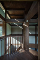 浜田晶則建築設計事務所による、山梨の「大法師山の立体格子」。街と山々を臨む“ひな壇状”の土地に建つ社屋。“自然と一体となる思想”を持つ伝統構法の“懸造”を参照し、木組の土台を全体に拡張した“立体格子”の建築を考案。幾重に重なる軸組の層が空間に奥行きをもたらす2階から屋根階への階段 photo©長谷川健太