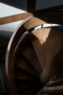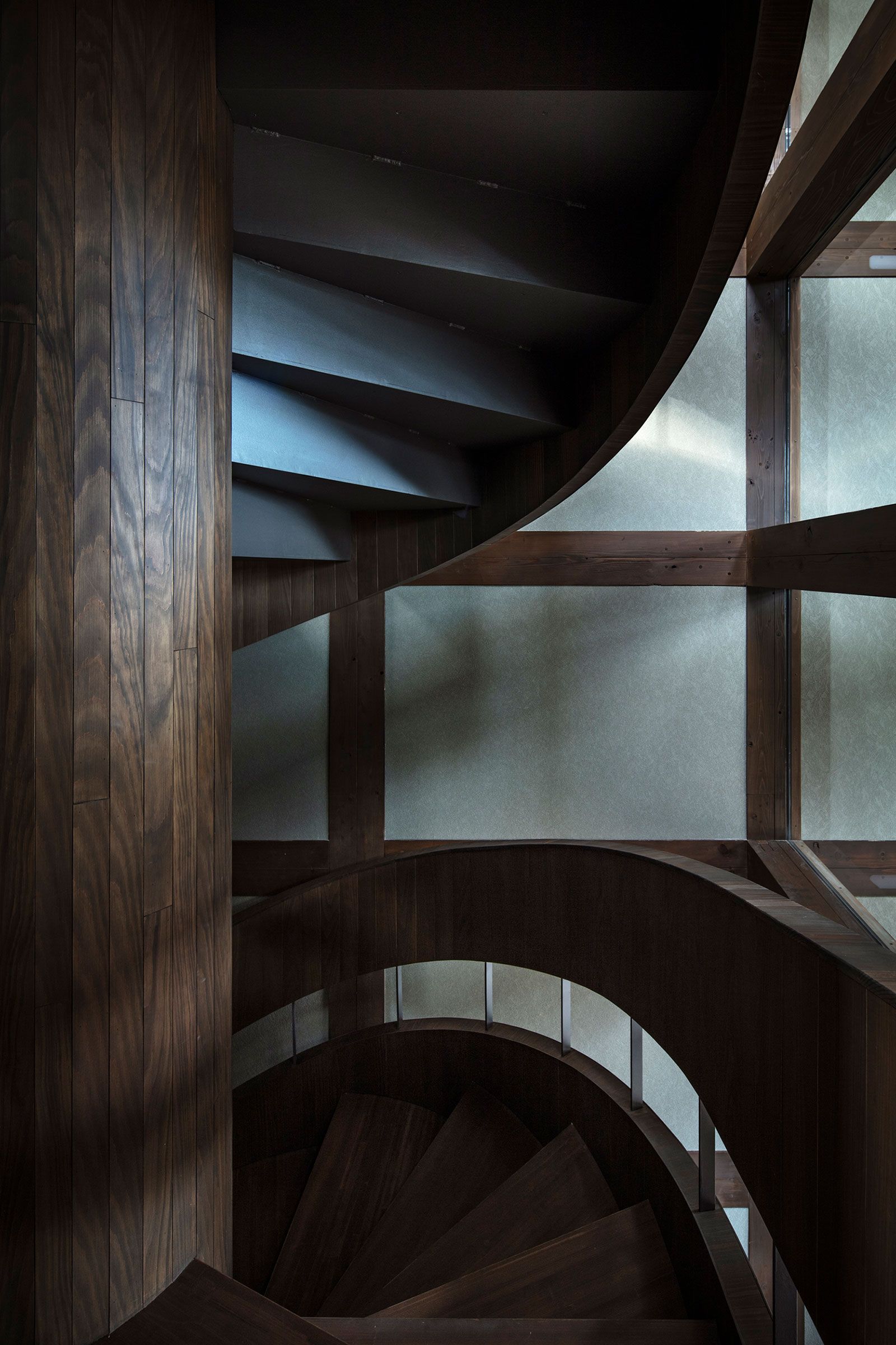 An elliptical spiral staircase: The primary structure is made of steel, and its overall dimensions were determined based on the maximum size allowable for delivery and the floor layouts of each level. By adopting a hybrid system of wood and steel, a sense of levitation was achieved—making the massive wooden form appear to float.