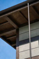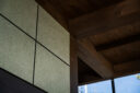 浜田晶則建築設計事務所による、山梨の「大法師山の立体格子」。街と山々を臨む“ひな壇状”の土地に建つ社屋。“自然と一体となる思想”を持つ伝統構法の“懸造”を参照し、木組の土台を全体に拡張した“立体格子”の建築を考案。幾重に重なる軸組の層が空間に奥行きをもたらす軒裏と外壁の詳細 photo©長谷川健太