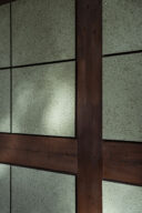 ③120角の一般流通製材の束ね柱や束ね梁の構成により、様々なスパンやたわみに対応することができることに加え、建具枠・壁パネル・設備など従来の木造軸組工法において加算的となる構成要素を構造材のディテールに統合した。構造材へ施す各納まりの加工はプレカット時に行い、現場対応を複雑化しないよう配慮した。これらは、抽象的なフレーミングを実現するための小さな工夫であり、RC造のディテールを転用したものである。