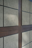 浜田晶則建築設計事務所による、山梨の「大法師山の立体格子」。街と山々を臨む“ひな壇状”の土地に建つ社屋。“自然と一体となる思想”を持つ伝統構法の“懸造”を参照し、木組の土台を全体に拡張した“立体格子”の建築を考案。幾重に重なる軸組の層が空間に奥行きをもたらす外壁の詳細