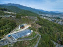 浜田晶則建築設計事務所による、山梨の「大法師山の立体格子」。街と山々を臨む“ひな壇状”の土地に建つ社屋。“自然と一体となる思想”を持つ伝統構法の“懸造”を参照し、木組の土台を全体に拡張した“立体格子”の建築を考案。幾重に重なる軸組の層が空間に奥行きをもたらす鳥瞰、南東側より見下ろす。 photo©長谷川健太
