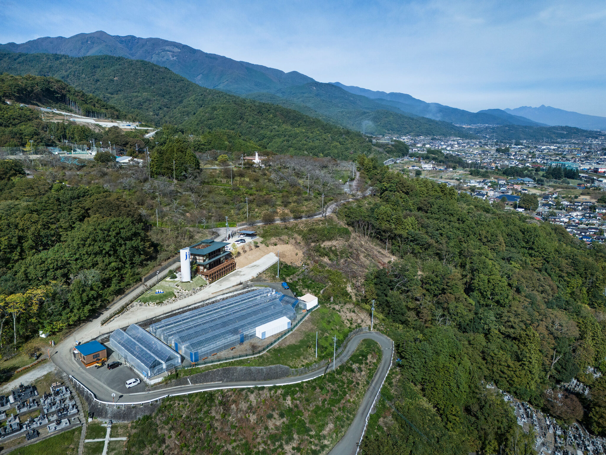 浜田晶則建築設計事務所による、山梨の「大法師山の立体格子」。街と山々を臨む“ひな壇状”の土地に建つ社屋。“自然と一体となる思想”を持つ伝統構法の“懸造”を参照し、木組の土台を全体に拡張した“立体格子”の建築を考案。幾重に重なる軸組の層が空間に奥行きをもたらす俯瞰、東側より見る。 photo©長谷川健太