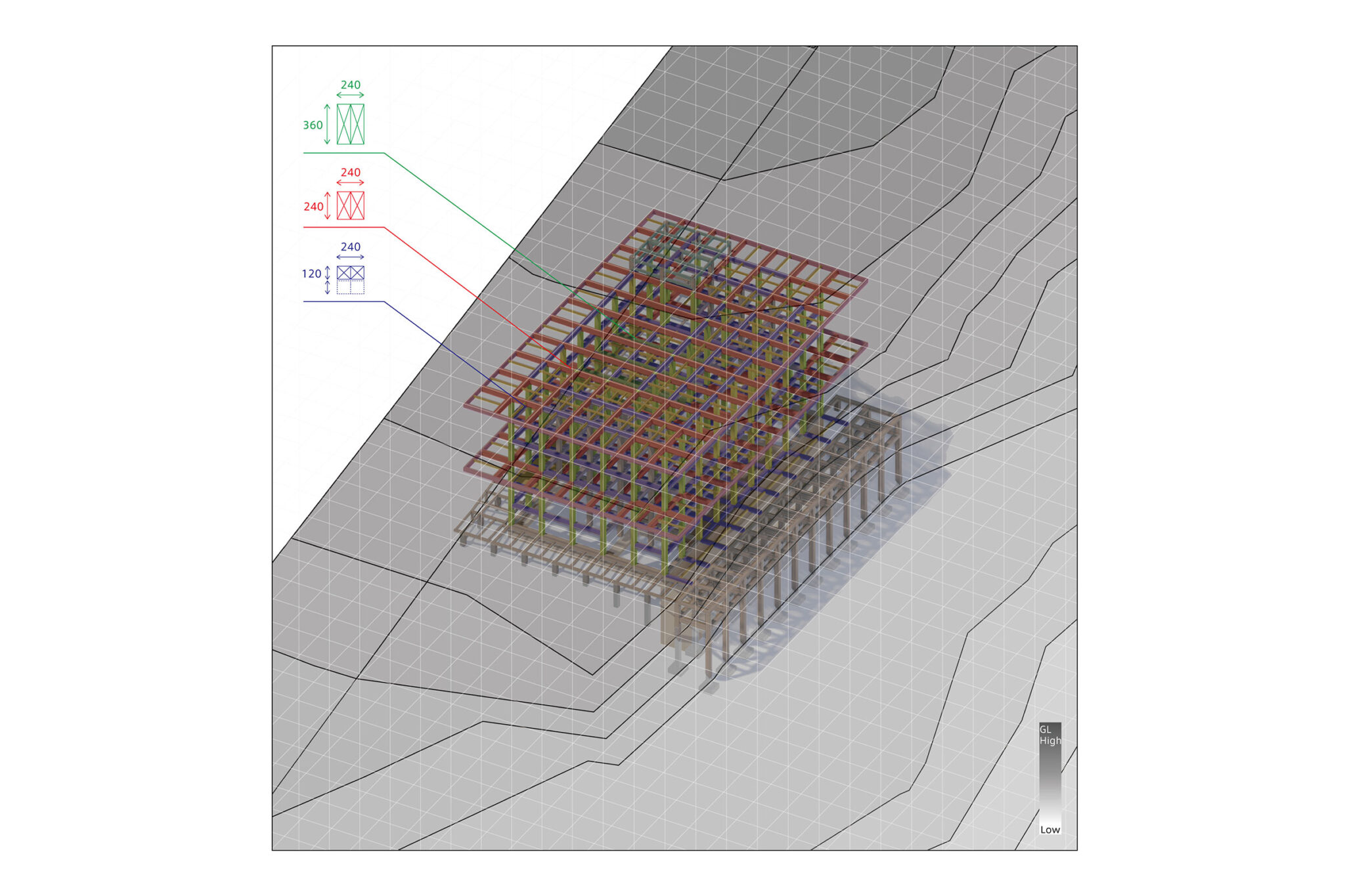 街と山々を臨む“ひな壇状”の土地に建つ社屋の計画です。建築家は、“自然と一体となる思想”を持つ伝統構法の“懸造”を参照し、木組の土台を全体に拡張した“立体格子”の建築を考案しました。そして、幾重に重なる軸組の層が空間に奥行きをもたらします。