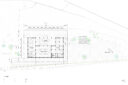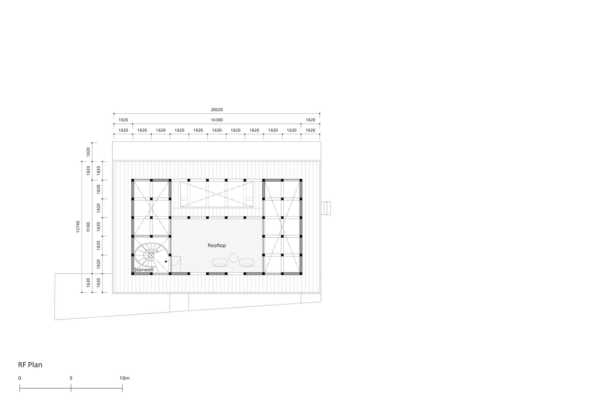 浜田晶則建築設計事務所による、山梨の「大法師山の立体格子」。街と山々を臨む“ひな壇状”の土地に建つ社屋。“自然と一体となる思想”を持つ伝統構法の“懸造”を参照し、木組の土台を全体に拡張した“立体格子”の建築を考案。幾重に重なる軸組の層が空間に奥行きをもたらす屋根階平面図 image©浜田晶則建築設計事務所