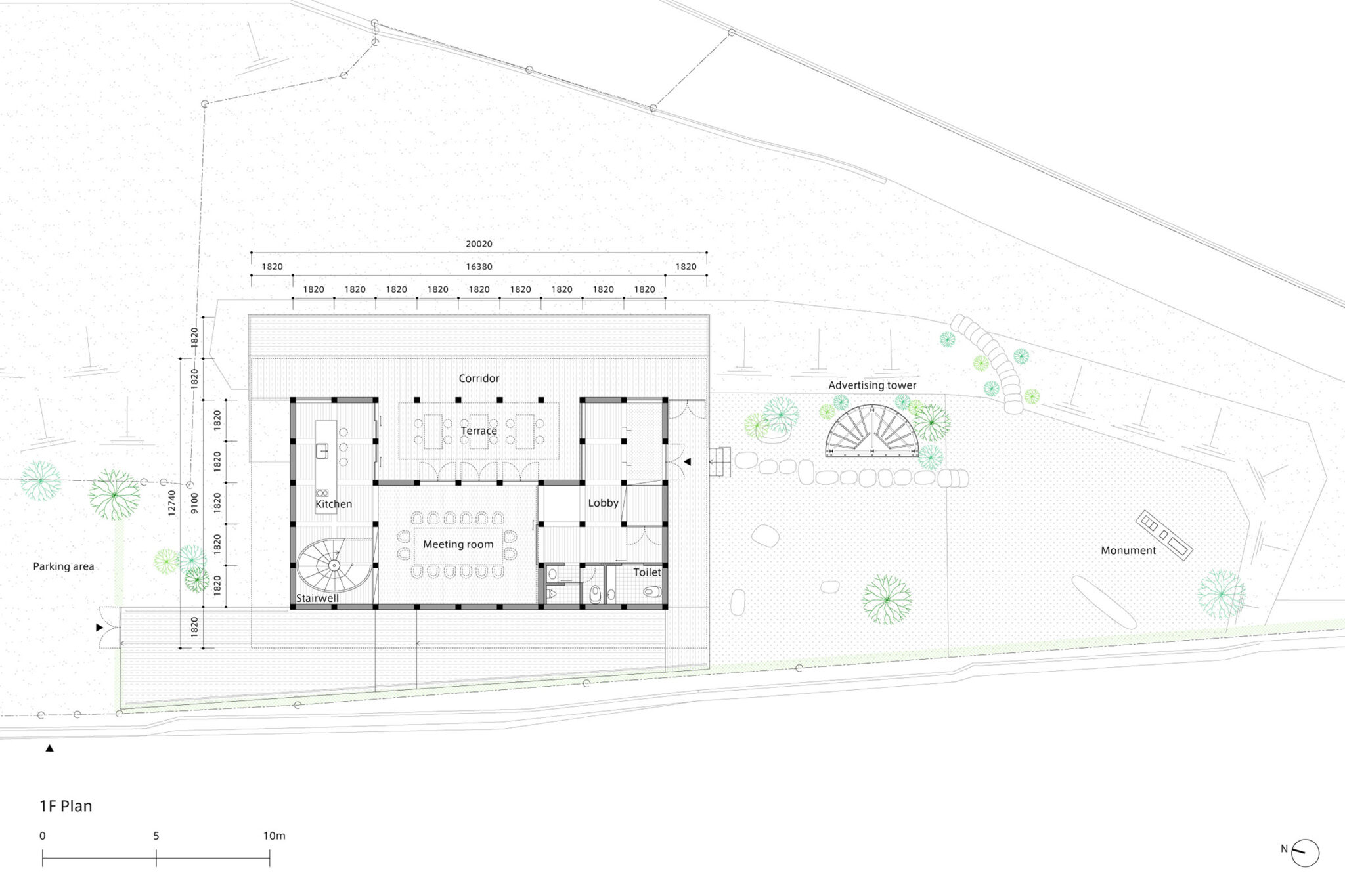 浜田晶則建築設計事務所による、山梨の「大法師山の立体格子」。街と山々を臨む“ひな壇状”の土地に建つ社屋。“自然と一体となる思想”を持つ伝統構法の“懸造”を参照し、木組の土台を全体に拡張した“立体格子”の建築を考案。幾重に重なる軸組の層が空間に奥行きをもたらす1階平面図 image©浜田晶則建築設計事務所