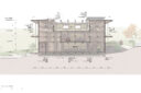 浜田晶則建築設計事務所による、山梨の「大法師山の立体格子」。街と山々を臨む“ひな壇状”の土地に建つ社屋。“自然と一体となる思想”を持つ伝統構法の“懸造”を参照し、木組の土台を全体に拡張した“立体格子”の建築を考案。幾重に重なる軸組の層が空間に奥行きをもたらす長手方向断面パース image©浜田晶則建築設計事務所