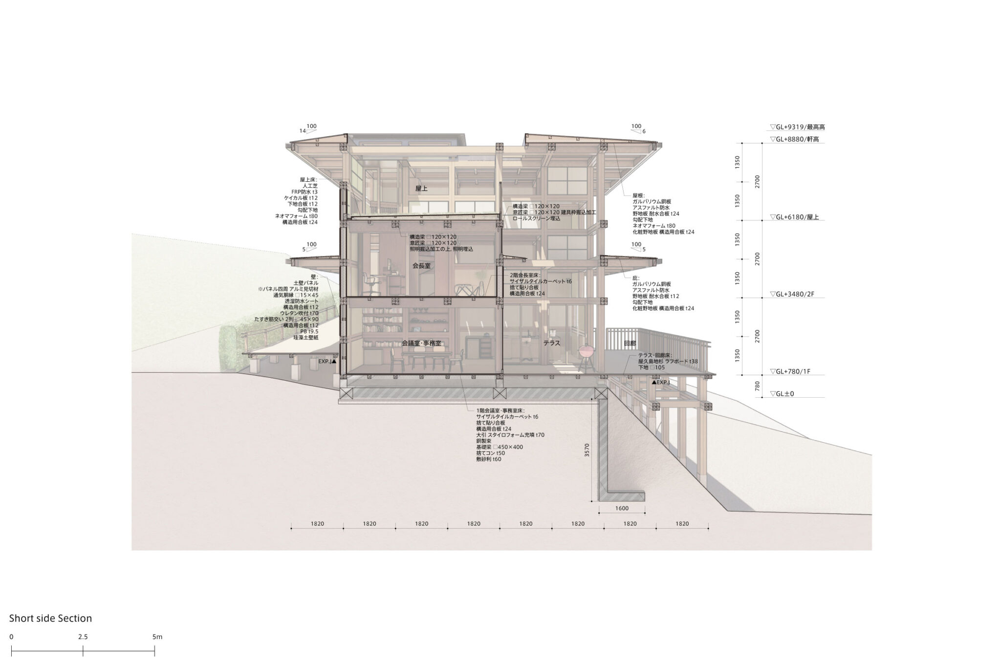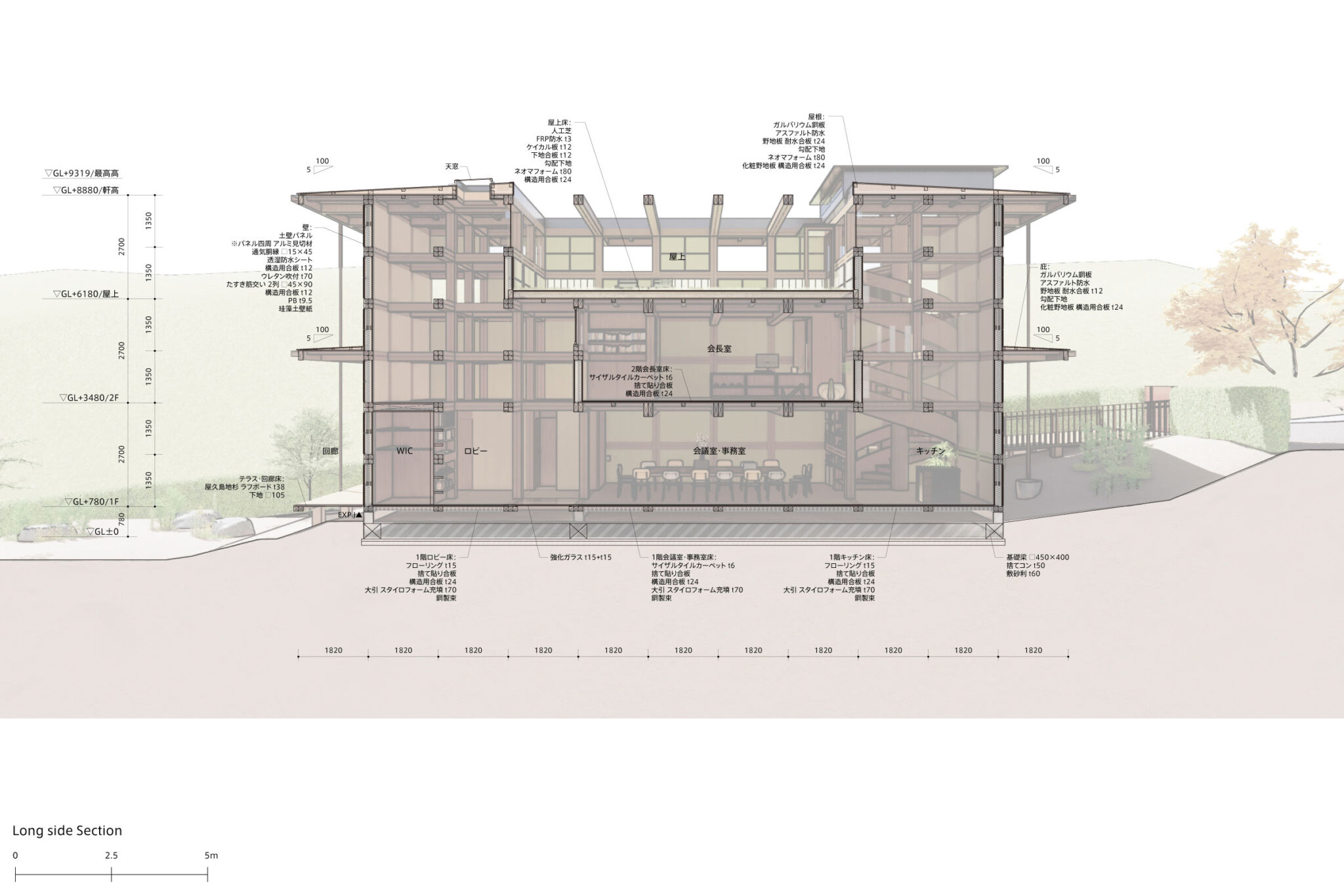 The terrace and corridor sections are based on the basic module, with a ceiling height of 2.70m and an eaves height of 4.05m. The intermediate space, enclosed by columns and beams, can be referred to as a engawa or portico, where people can gather regardless of the weather. In this semi-outdoor lattice-covered area, one can enjoy the view of the city while gazing at Mount Fuji.