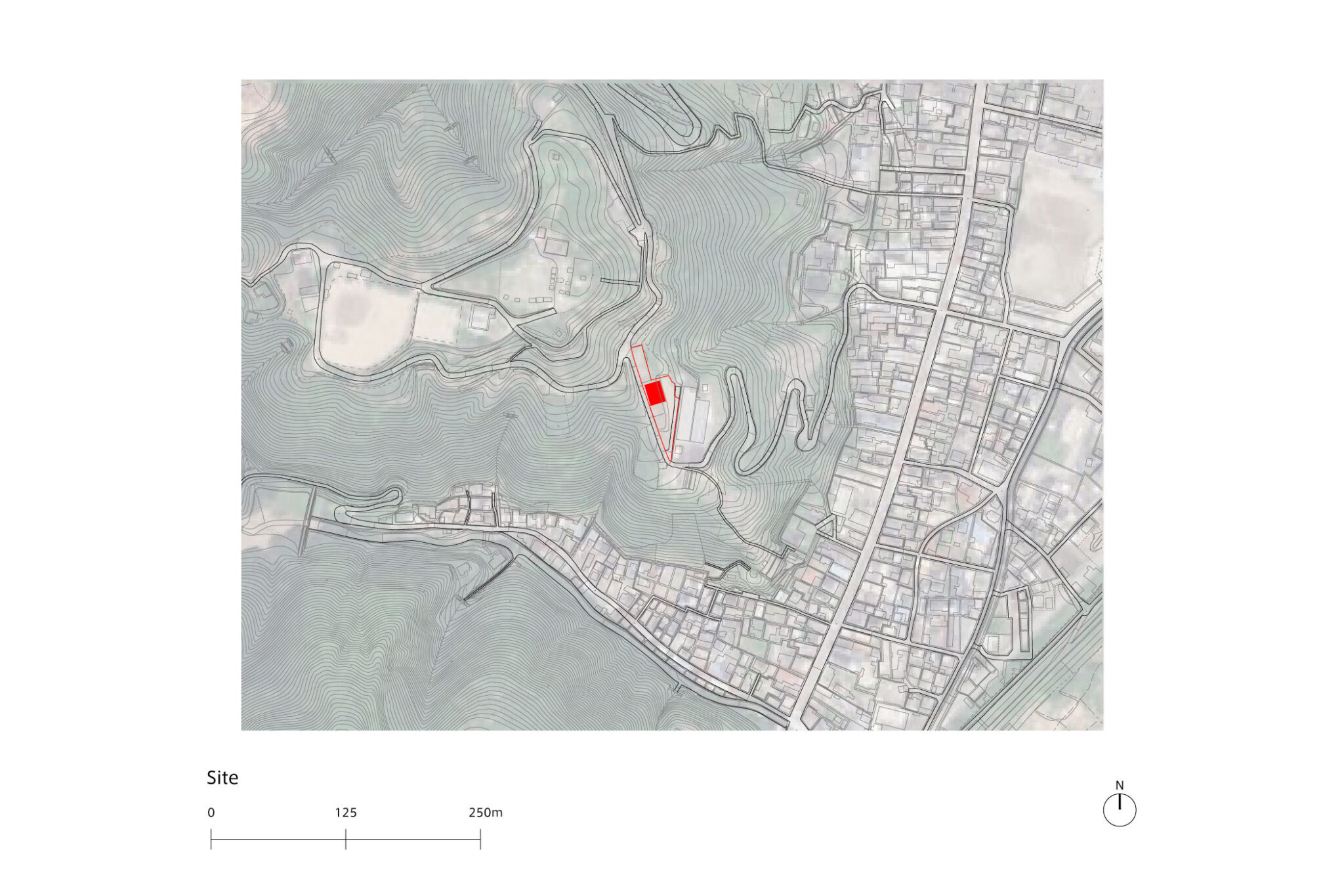 浜田晶則建築設計事務所による、山梨の「大法師山の立体格子」。街と山々を臨む“ひな壇状”の土地に建つ社屋。“自然と一体となる思想”を持つ伝統構法の“懸造”を参照し、木組の土台を全体に拡張した“立体格子”の建築を考案。幾重に重なる軸組の層が空間に奥行きをもたらす配置図 image©浜田晶則建築設計事務所