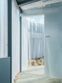 鈴木淳平・村部塁・溝端友輔による、大阪・関西万博の「島の蜃気楼(トイレ7)」。“象徴的な建築群”に囲まれた広場での計画。“周囲の現象のみ”を際立たせる在り方を求め、“蜘蛛の巣状”の平面形で“3Dプリント製のポリカパネル”を纏った建築を考案。環境との関係の中で存在が浮かび上がる男性用トイレの出口 photo©YU SUZUKI