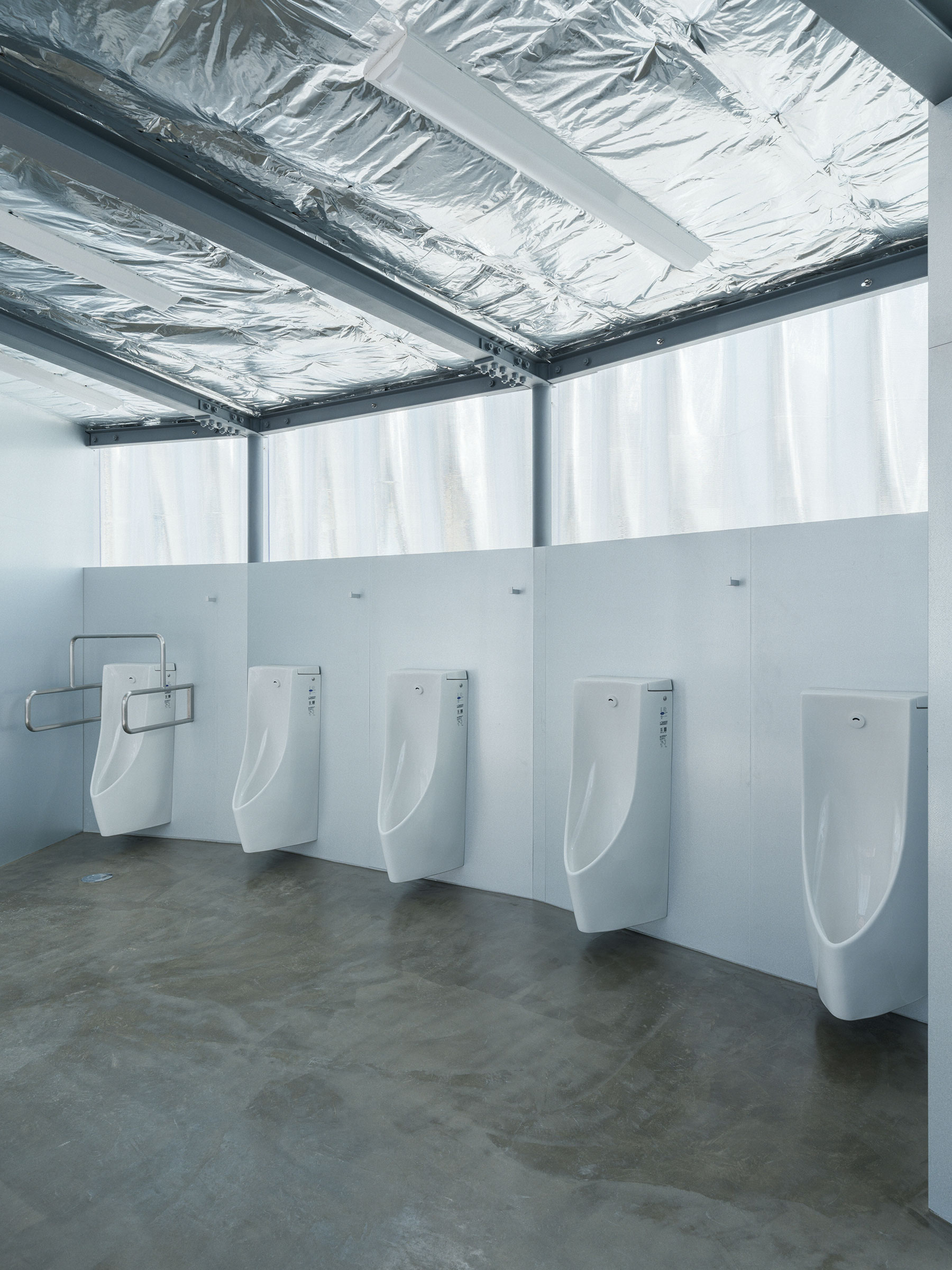 鈴木淳平・村部塁・溝端友輔による、大阪・関西万博の「島の蜃気楼(トイレ7)」。“象徴的な建築群”に囲まれた広場での計画。“周囲の現象のみ”を際立たせる在り方を求め、“蜘蛛の巣状”の平面形で“3Dプリント製のポリカパネル”を纏った建築を考案。環境との関係の中で存在が浮かび上がる男性用トイレ photo©YU SUZUKI