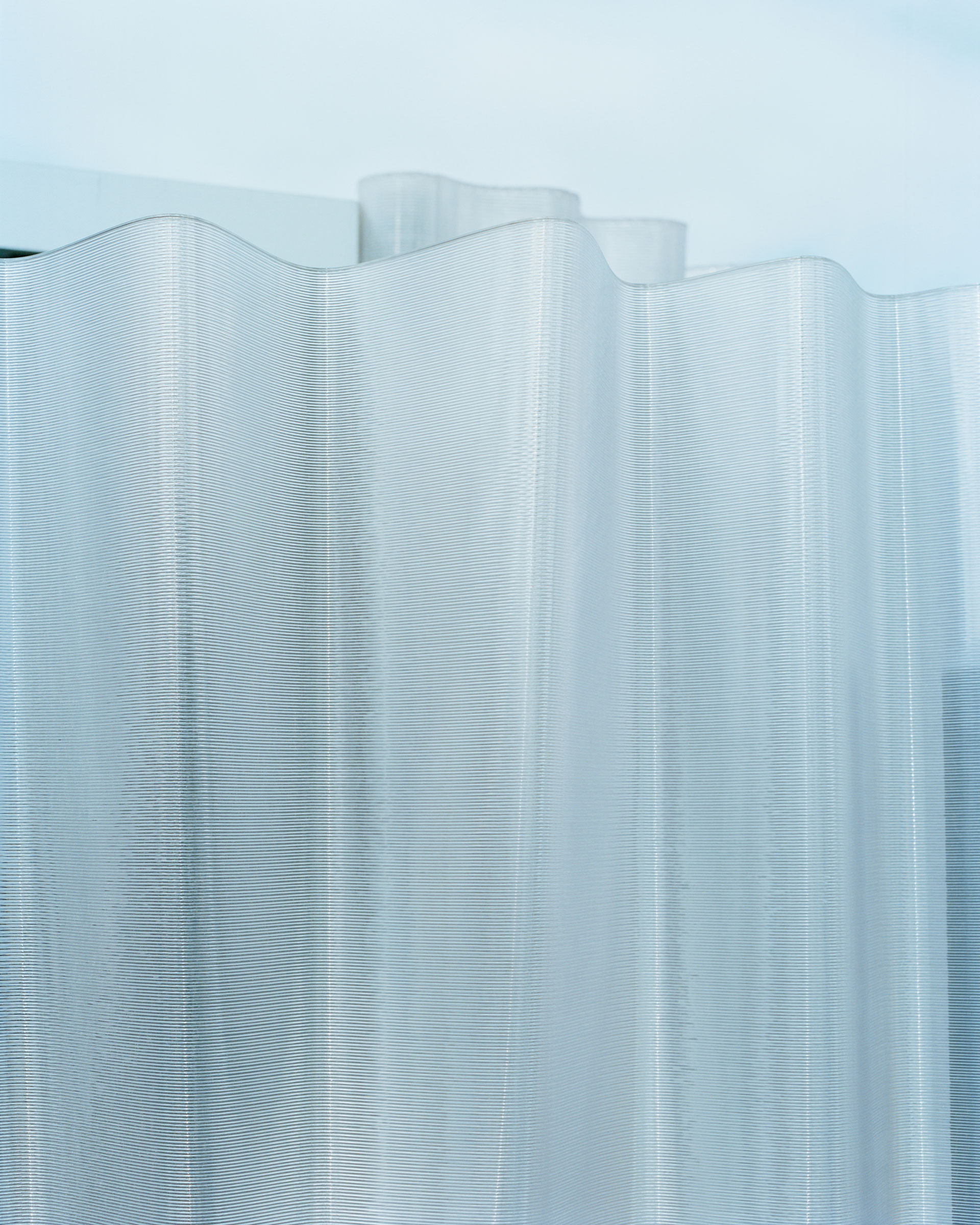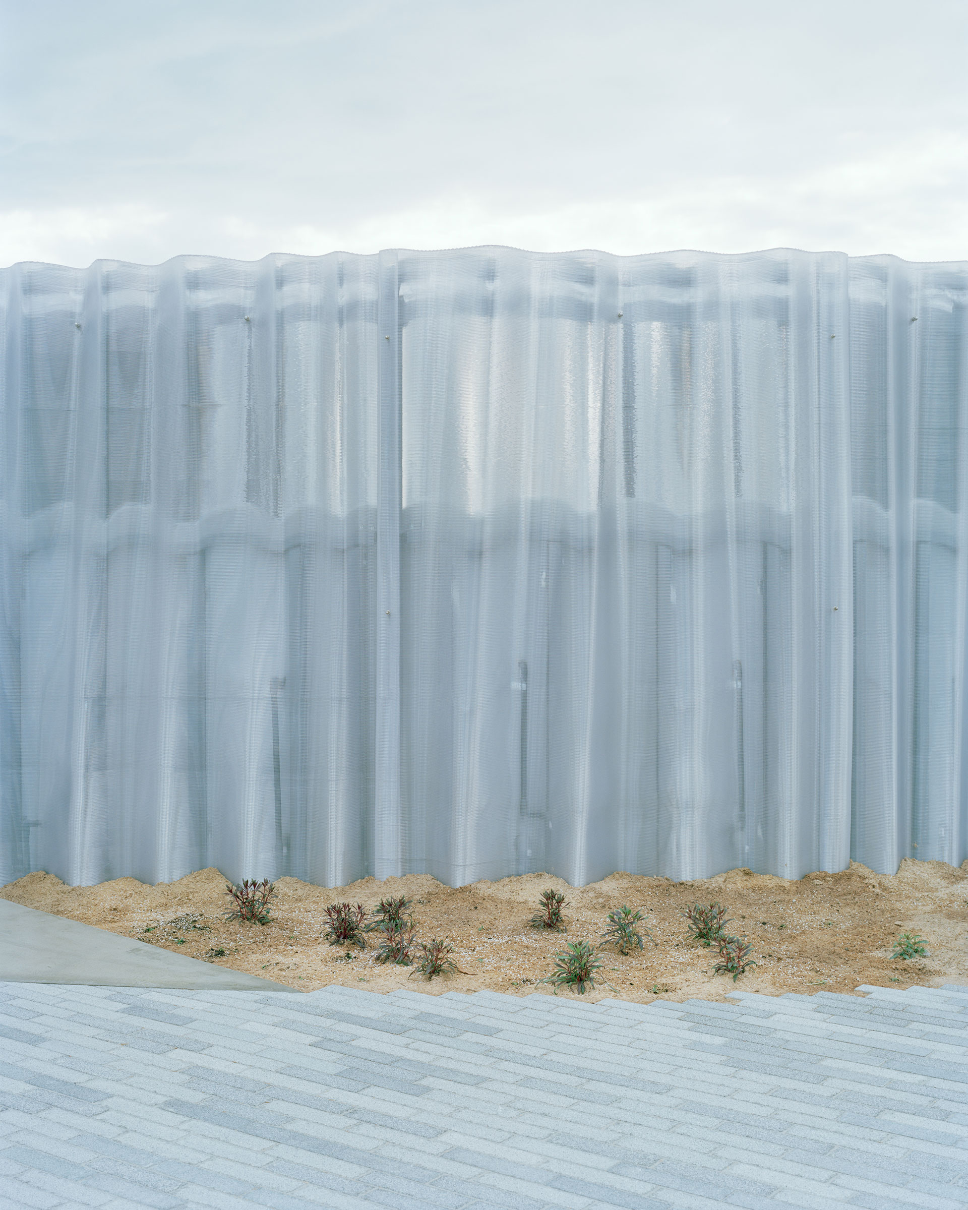 バリアフリートイレの壁面には3Dプリントの壁を2重に設置し、フルハイトの光の面をつくりだした。波形状の3Dプリントのパネルは製造時の歪みを多く含み、それらも建築の表情として積極的に取り入れている。反射性と透過性をあわせ持つ湾曲したパネルは、周囲の光を複雑にとらえ、周辺環境との関係によってその存在が浮かび上がる。