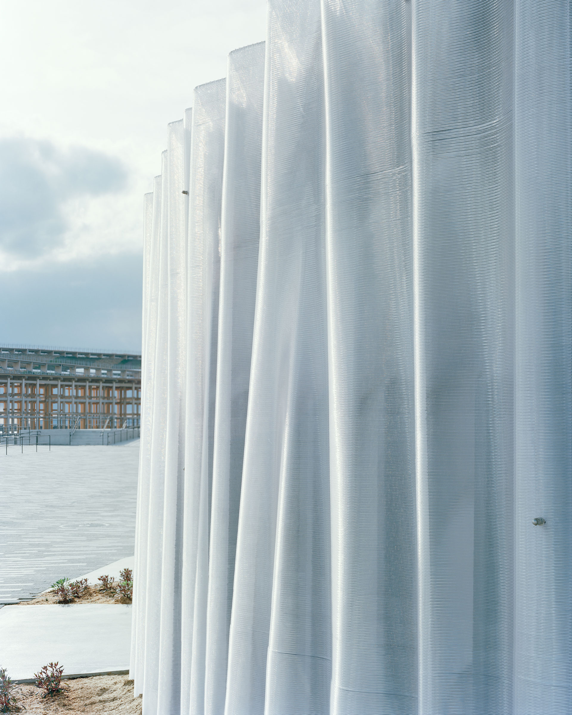 “象徴的な建築群”に囲まれた広場での計画です。建築家は、“周囲の現象のみ”を際立たせる在り方を求め、“蜘蛛の巣状”の平面形で“3Dプリント製のポリカパネル”を纏った建築を考案しました。そして、環境との関係の中で存在が浮かび上がります。施設の場所はこちら(万博公式PDF)。