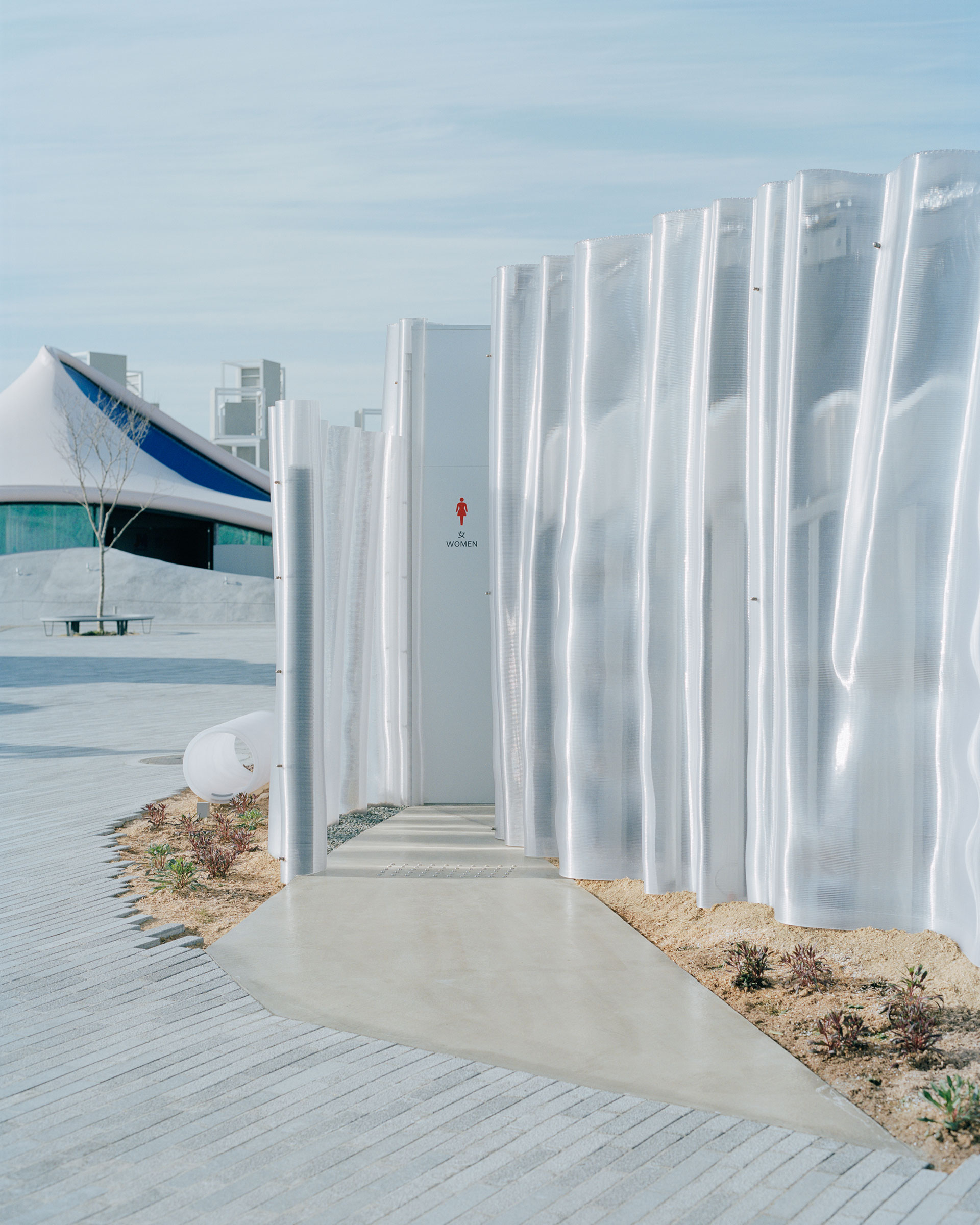 鈴木淳平・村部塁・溝端友輔による、大阪・関西万博の「島の蜃気楼(トイレ7)」。“象徴的な建築群”に囲まれた広場での計画。“周囲の現象のみ”を際立たせる在り方を求め、“蜘蛛の巣状”の平面形で“3Dプリント製のポリカパネル”を纏った建築を考案。環境との関係の中で存在が浮かび上がる女性用トイレ photo©YU SUZUKI